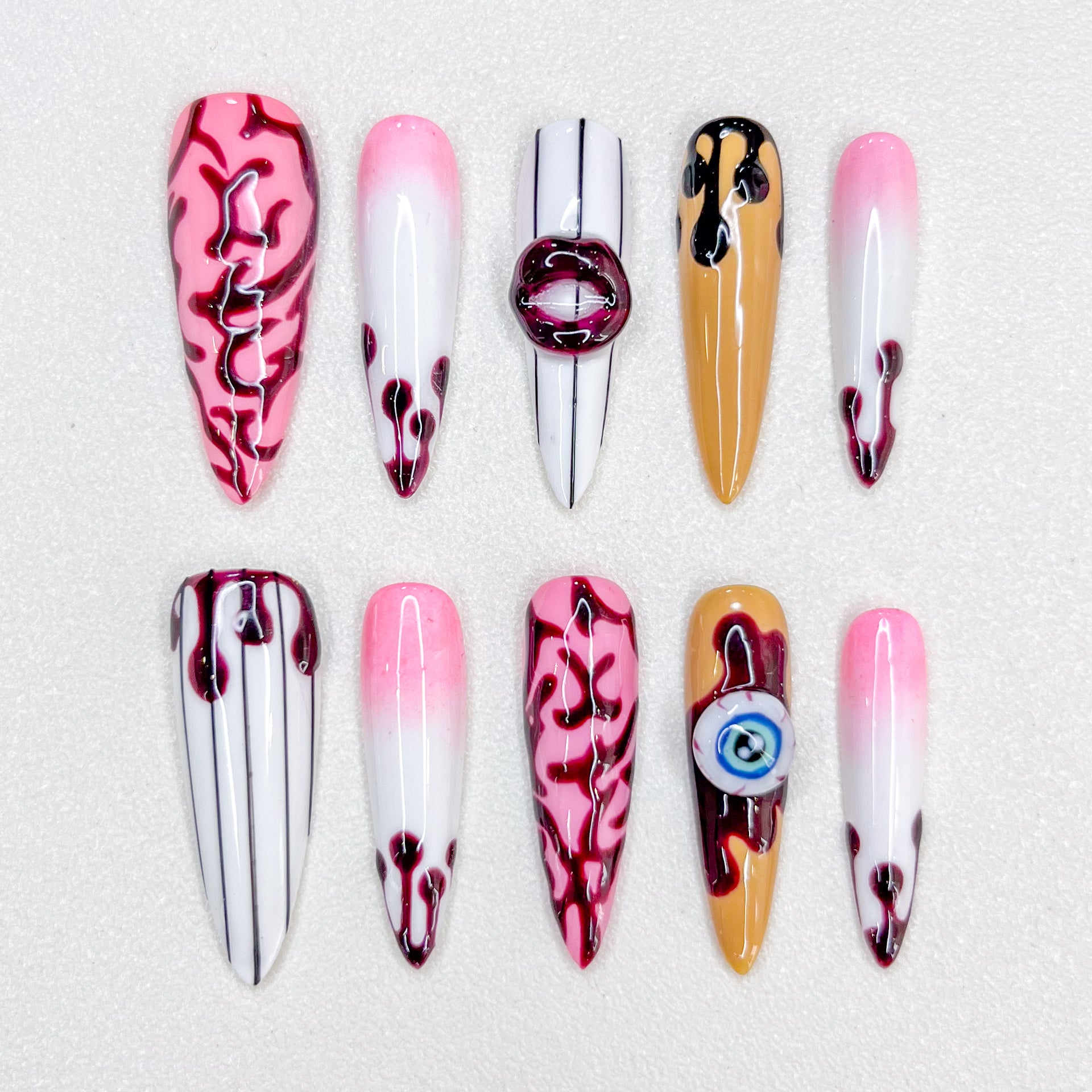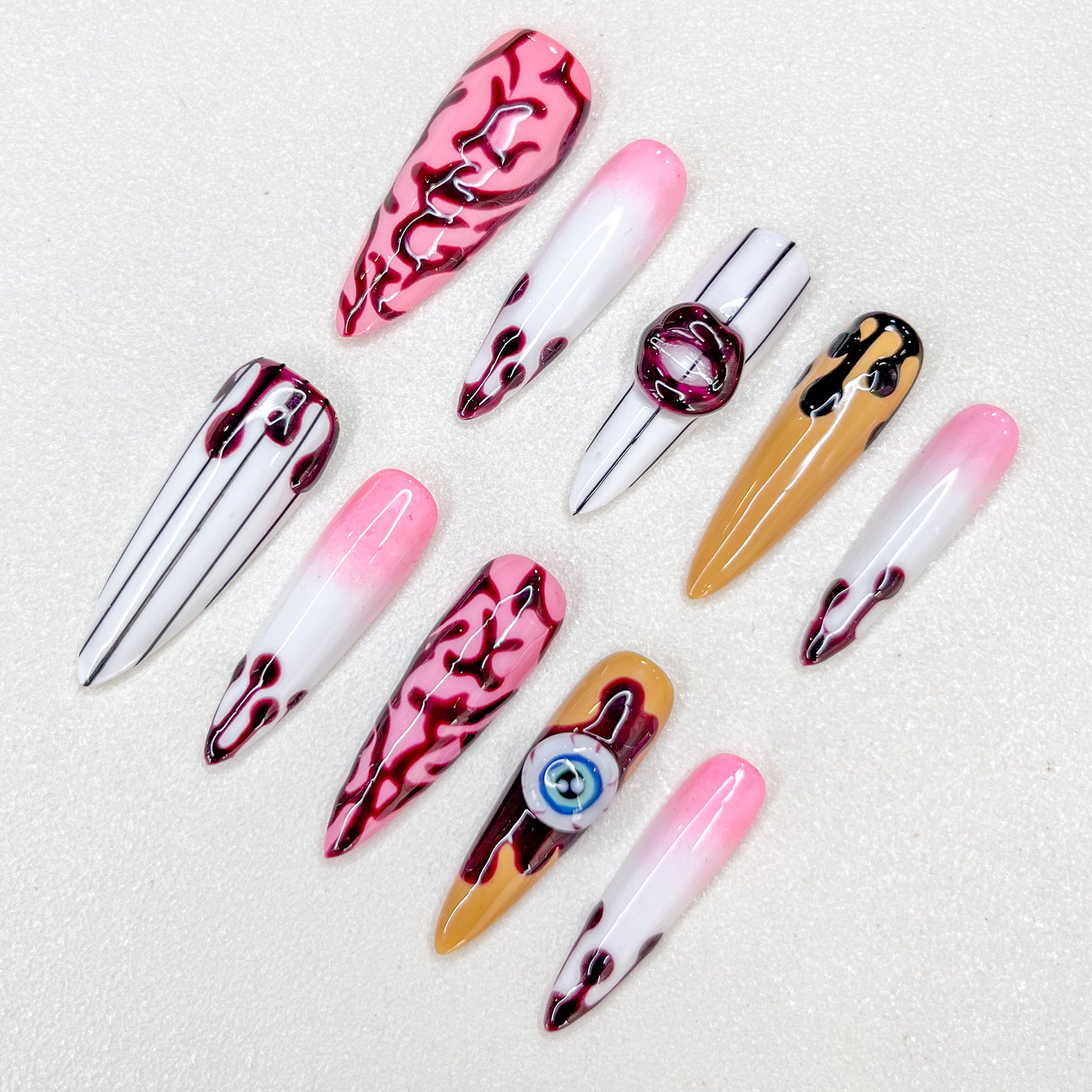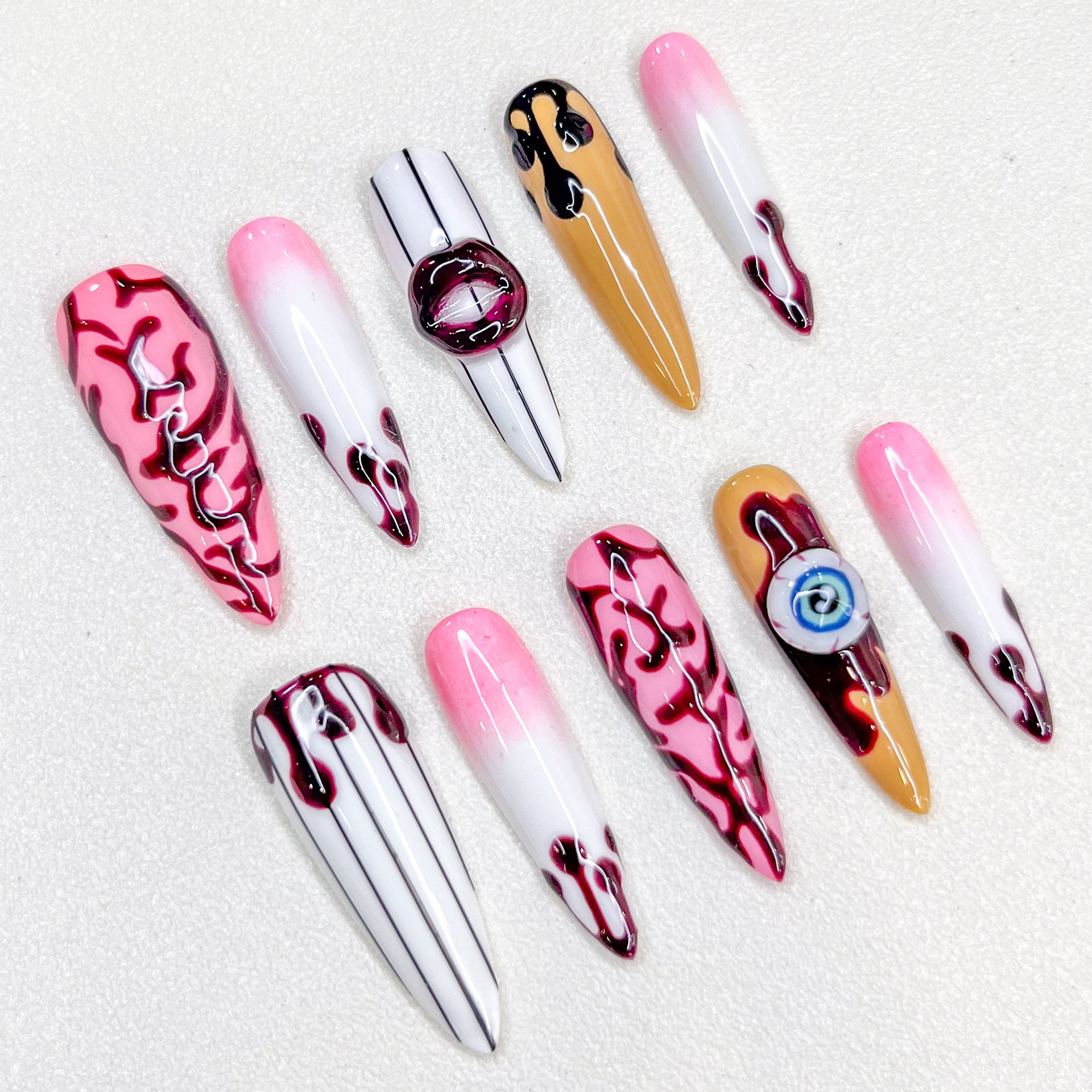 Design Concept: Get spooky with “Brain Freeze,” a chilling Halloween nail set that fuses eerie eyeballs, brainy textures, sexy lips, and a playful touch of pink. Perfect for those looking to dive deep into the haunted mind this season, with just the right amount of spooky glam!