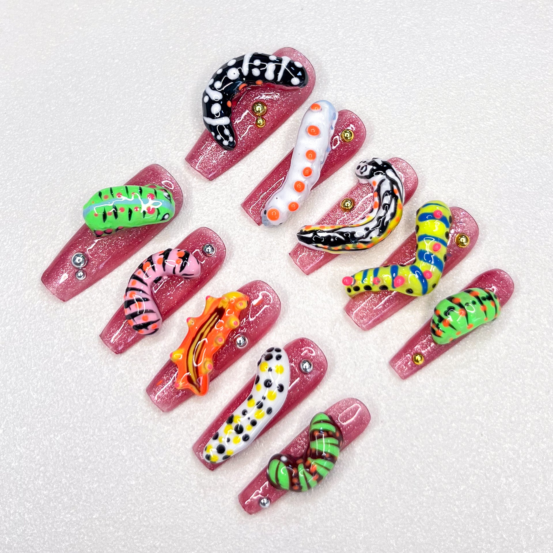 Design Concept: Step into a world of vibrant imagination with Caterpillar Quest. This design celebrates the whimsical journey of a caterpillar through a landscape of bold, adventurous colors. Let your nails embark on a colorful adventure, where every glance reveals a new chapter of exploration and delight.