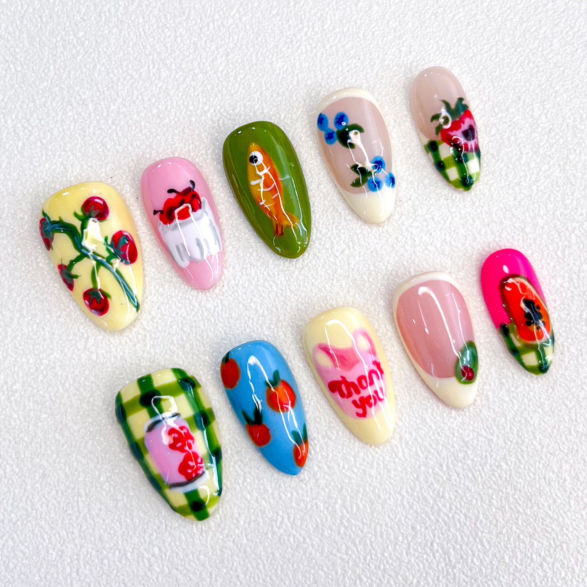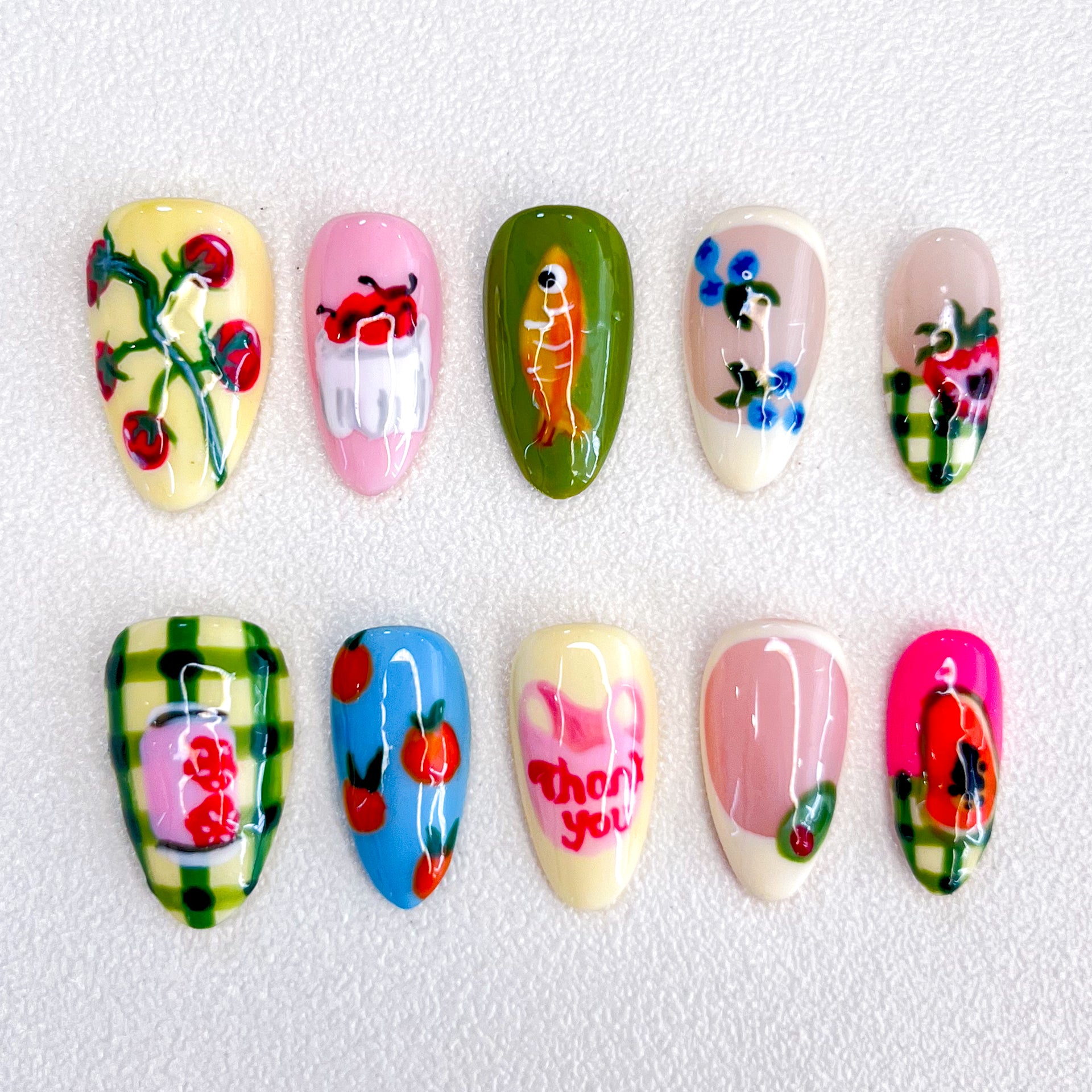 Design Concept: In a secret garden where vibrant petals kiss the shimmering water, koi fish glide gracefully beneath the surface, and the air is sweet with the scent of summer fruits. Your nails become a living canvas, capturing the essence of this joyful, dopamine-filled paradise.