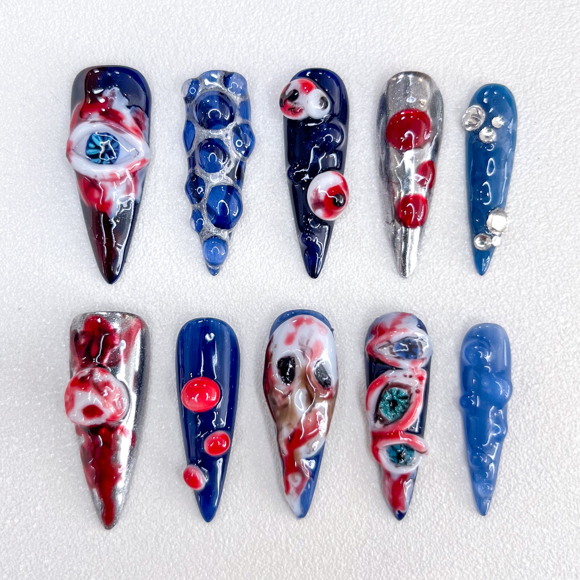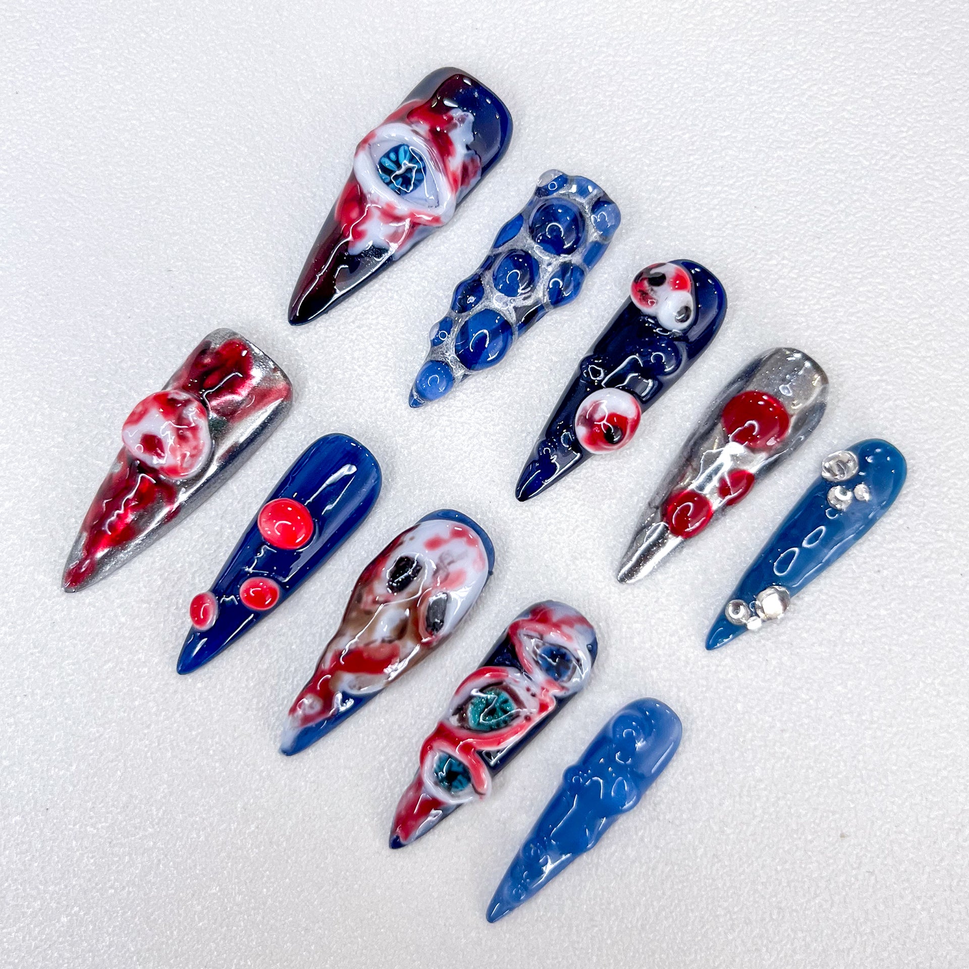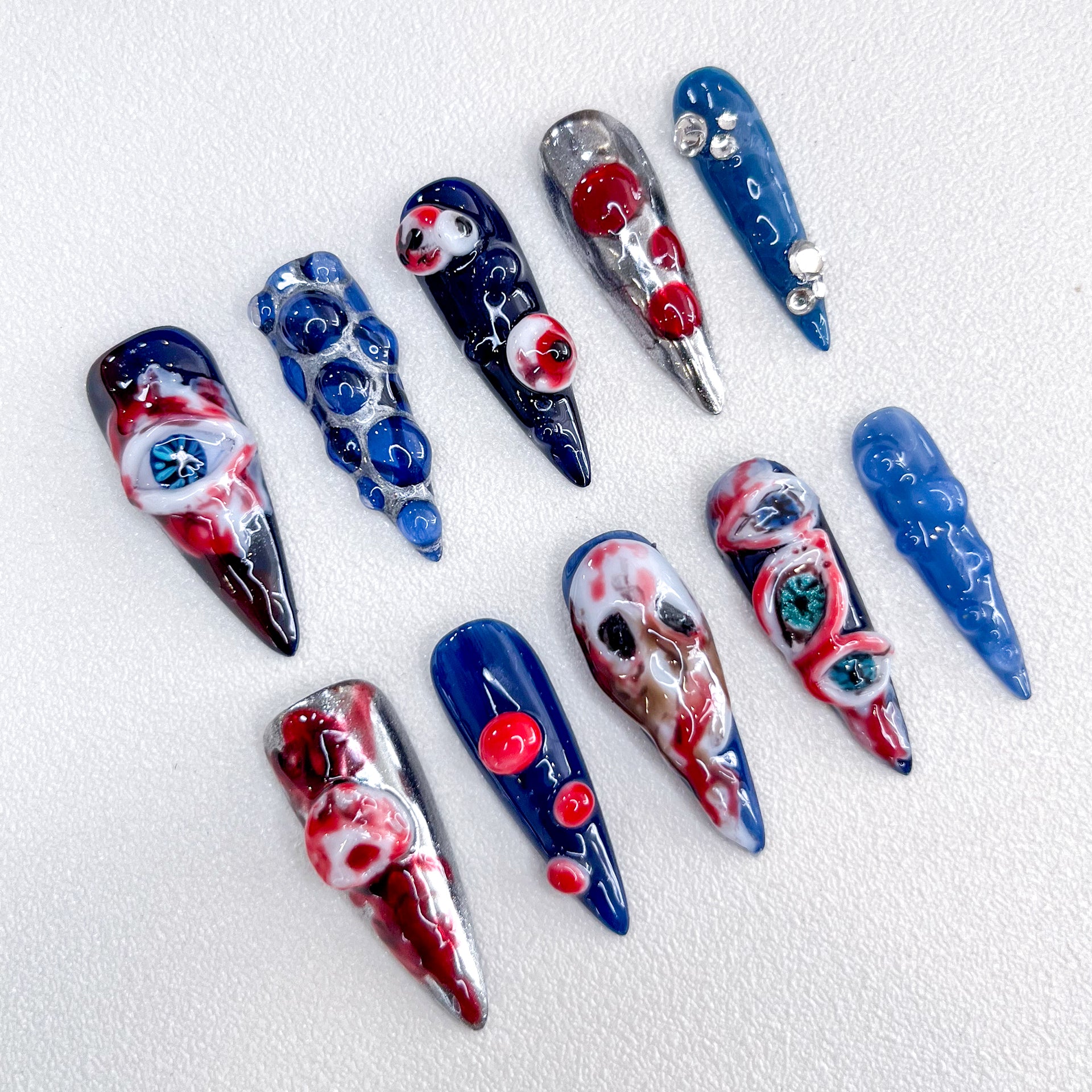 Design Concept: Embrace the eerie allure of our "Crimson Eyes" design. Featuring vivid red eyeballs dripping with blood against a striking blue background, this set captures a hauntingly beautiful contrast. Perfect for those who dare to stand out, these nails blend vibrant colors with a touch of the macabre.