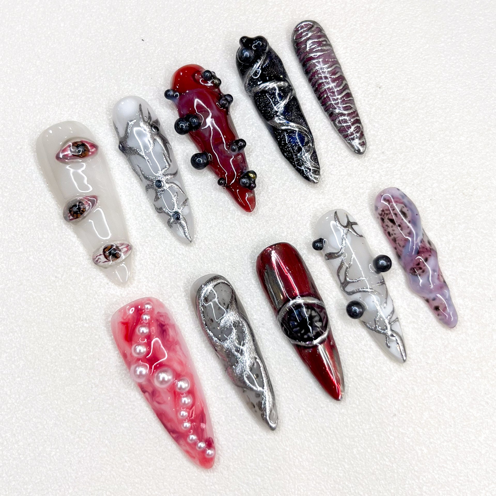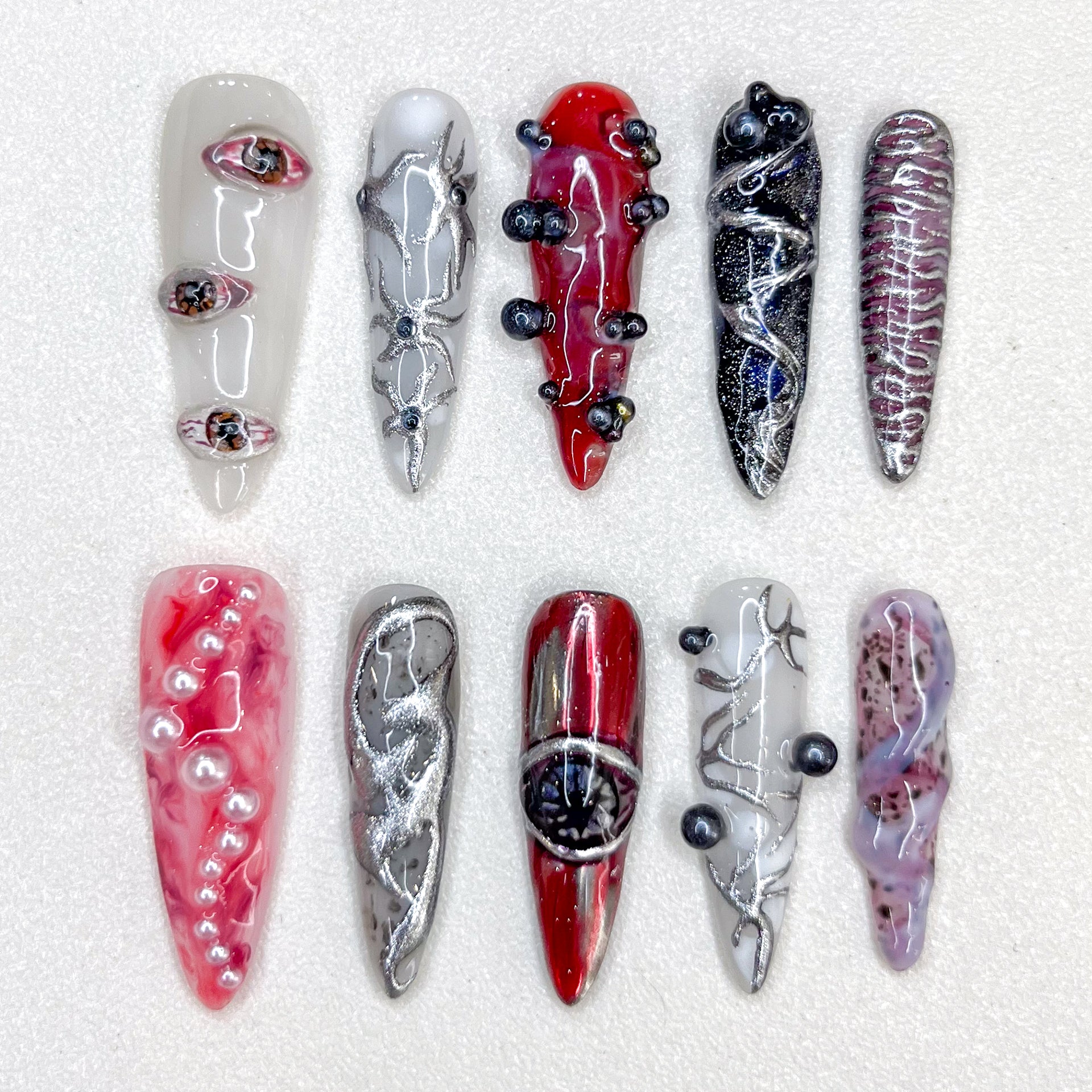 Design Concept: Crimson eyes pierce through the silver of the night, blood drips in the shadows, and the howl of Halloween fills the air. These nails, with bold red and silver accents, embody the fierce spirit of Halloween night.