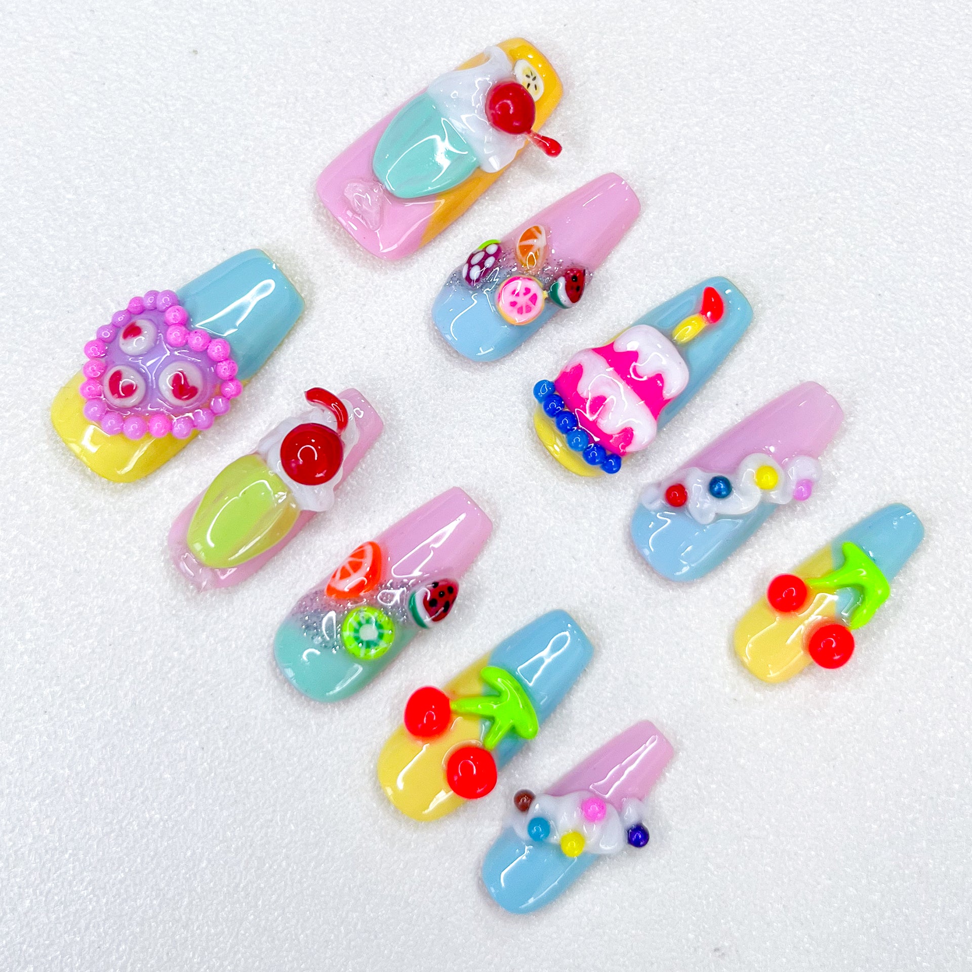 Design Concept: A burst of vibrant colors, playful cherries, and a fruity mix, this design is like a slice of birthday cake for your nails. The cheerful patterns and sweet vibes are perfect for celebrating life’s happy moments. Overflowing with dopamine-inducing hues, it’s as delightful and joyful as a delicious treat. Bring out your fun, carefree side with this charming, cute set!