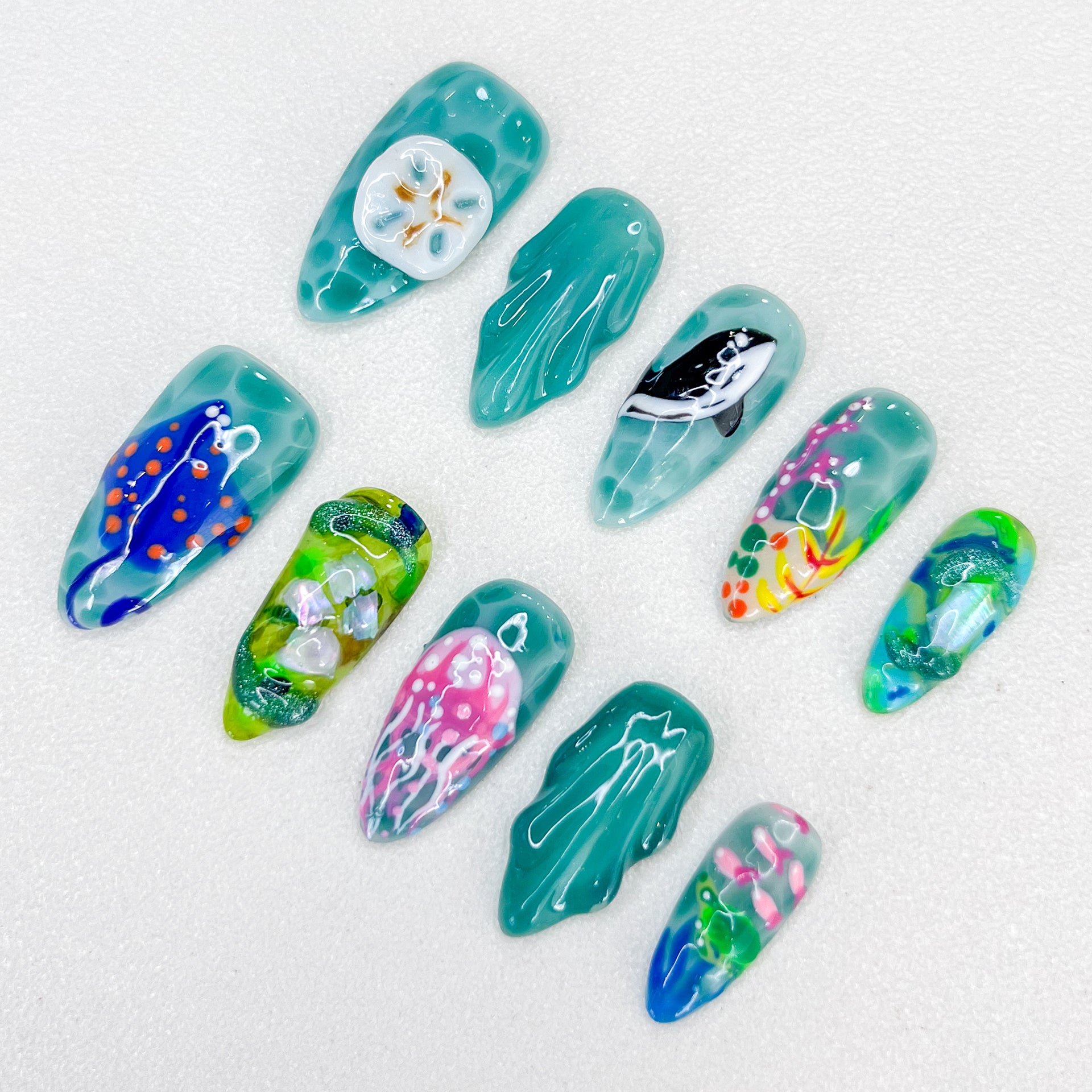 Design Concept: Descend into the depths of the ocean, where the emerald glow of the sea meets the graceful presence of whales. Let your nails capture the breathtaking beauty of this underwater paradise.
