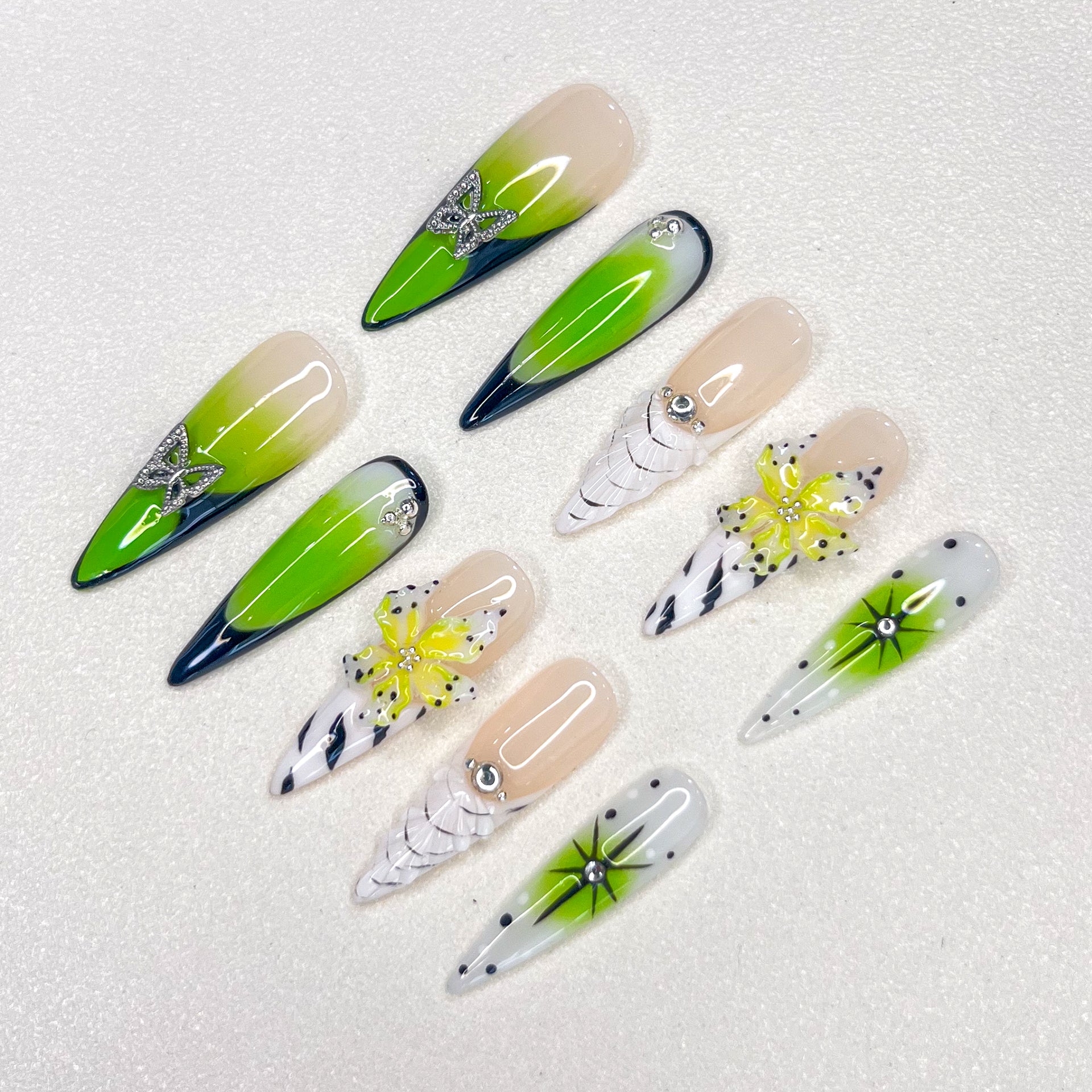 Design Concept: Discover the "Emerald Butterfly Garden", where lush emerald greens blend with the delicate charm of butterflies and blooming flowers. This enchanting collection captures nature’s elegance, adding a touch of whimsical beauty to your nails. Embrace the grace and sophistication of a hidden garden with every wear.