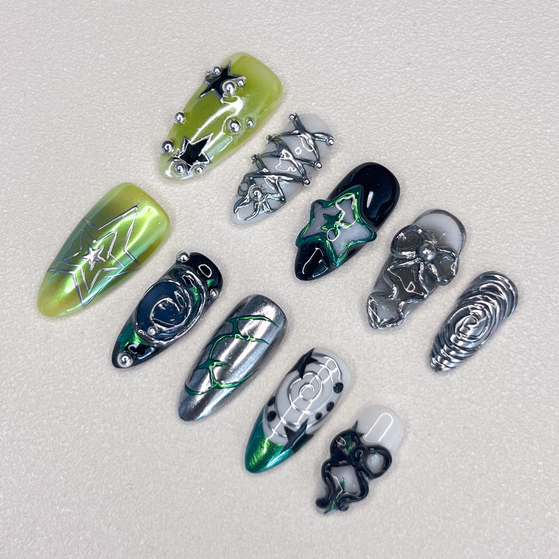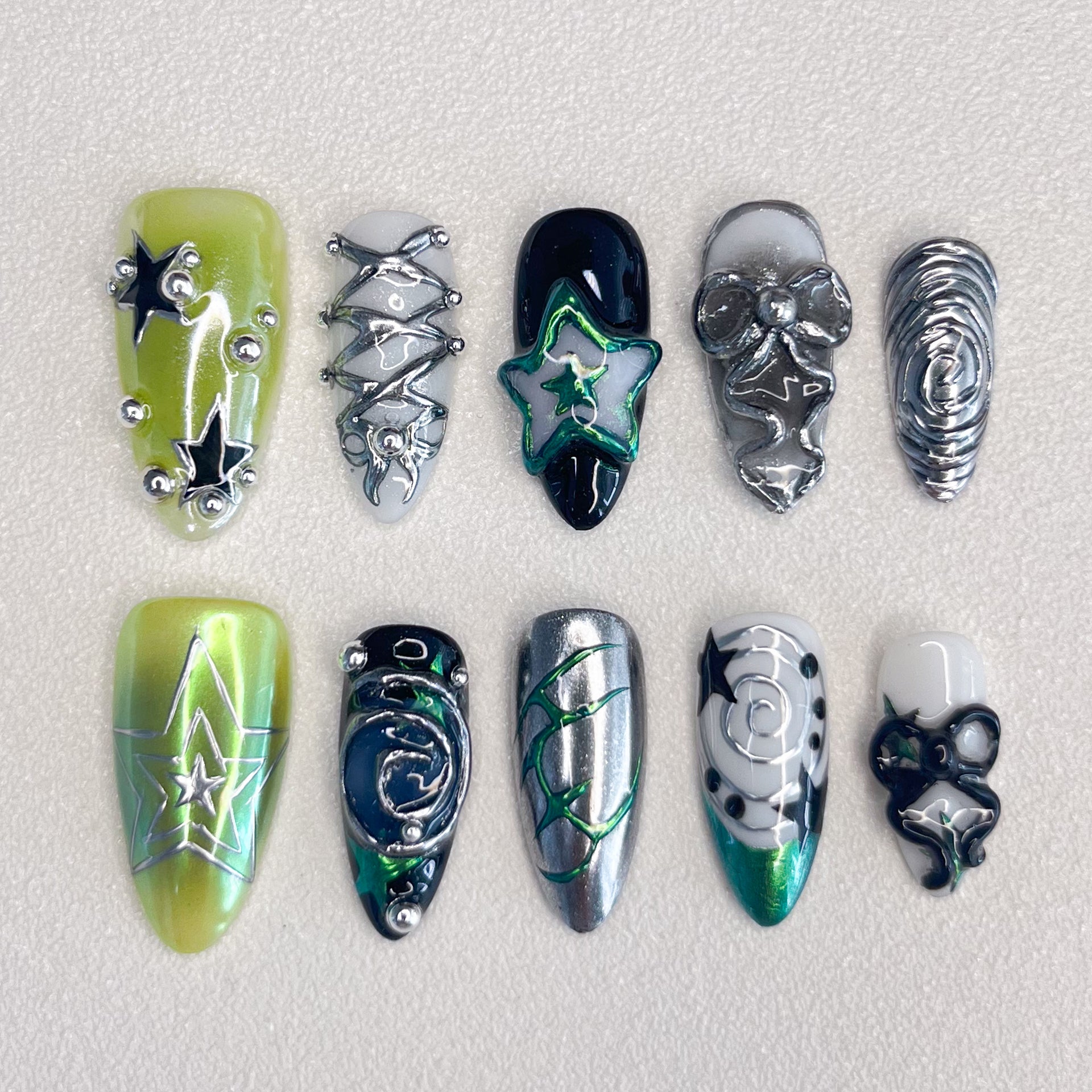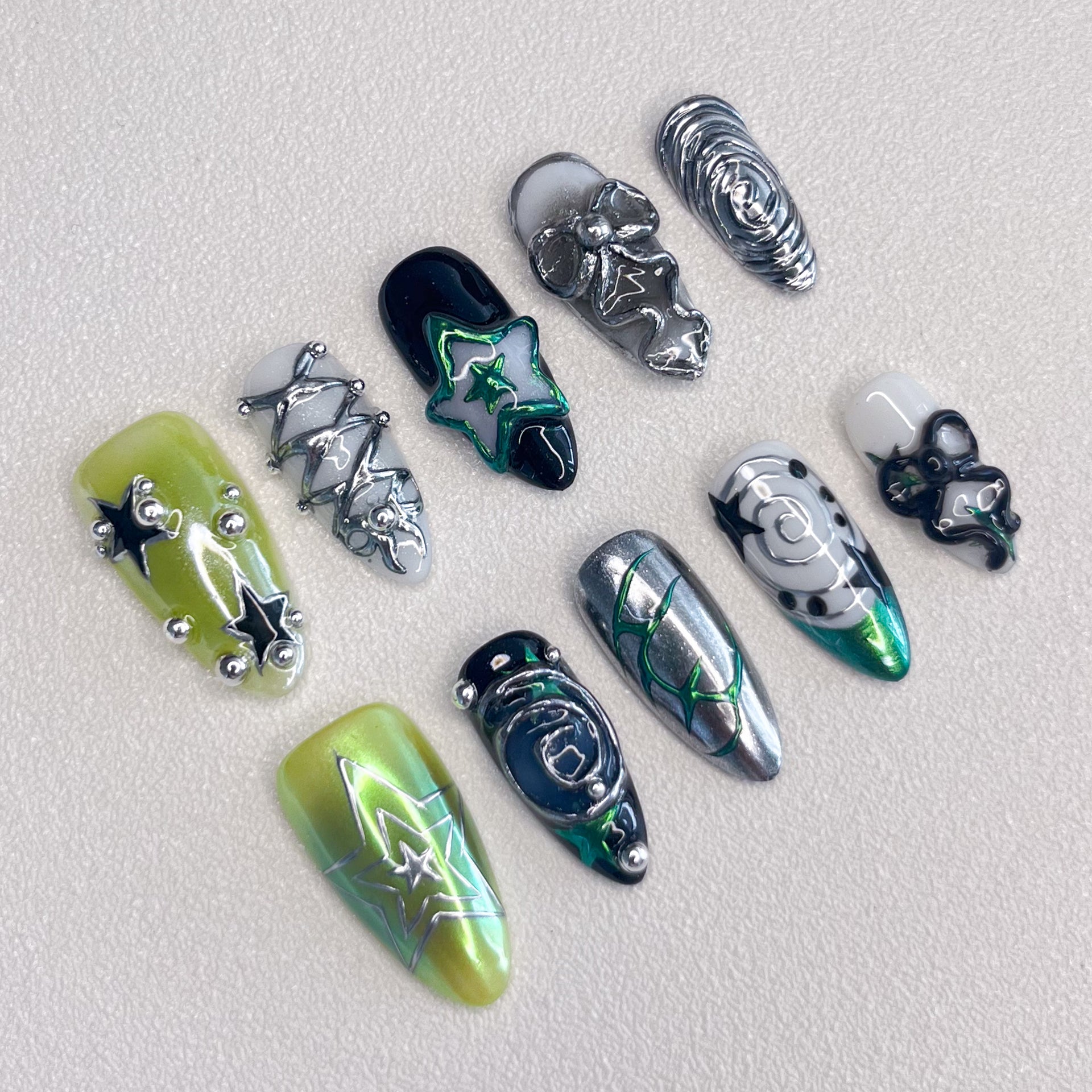 Design Concept: Dive into the captivating blend of green and silver with Emerald Starlight. This design sparkles like a constellation of stars, where the emerald hues meet shimmering silver, creating a cosmic elegance.