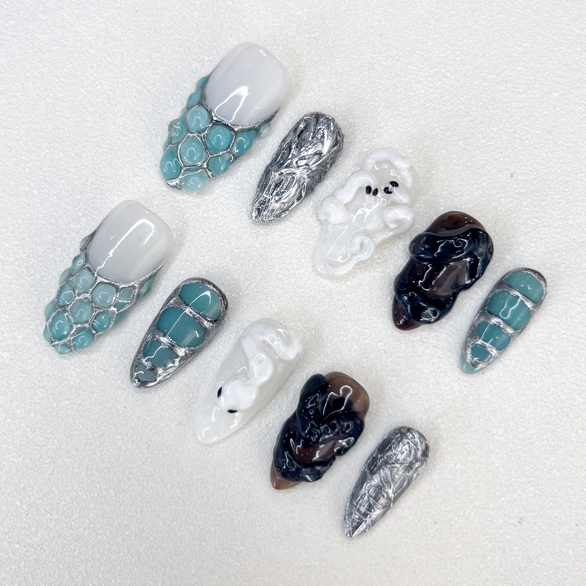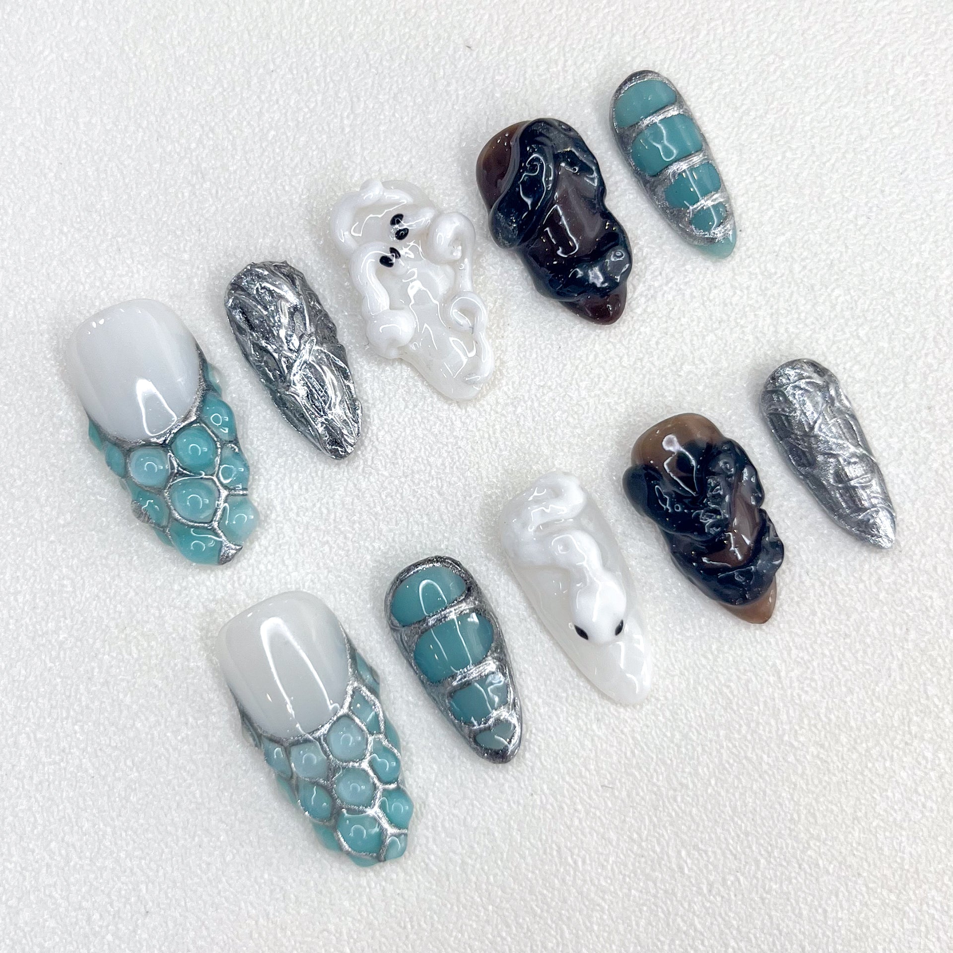 Design Concept: Wrap your nails in the captivating elegance of emerald green, where the grace of a white snake evokes timeless mystique and allure.