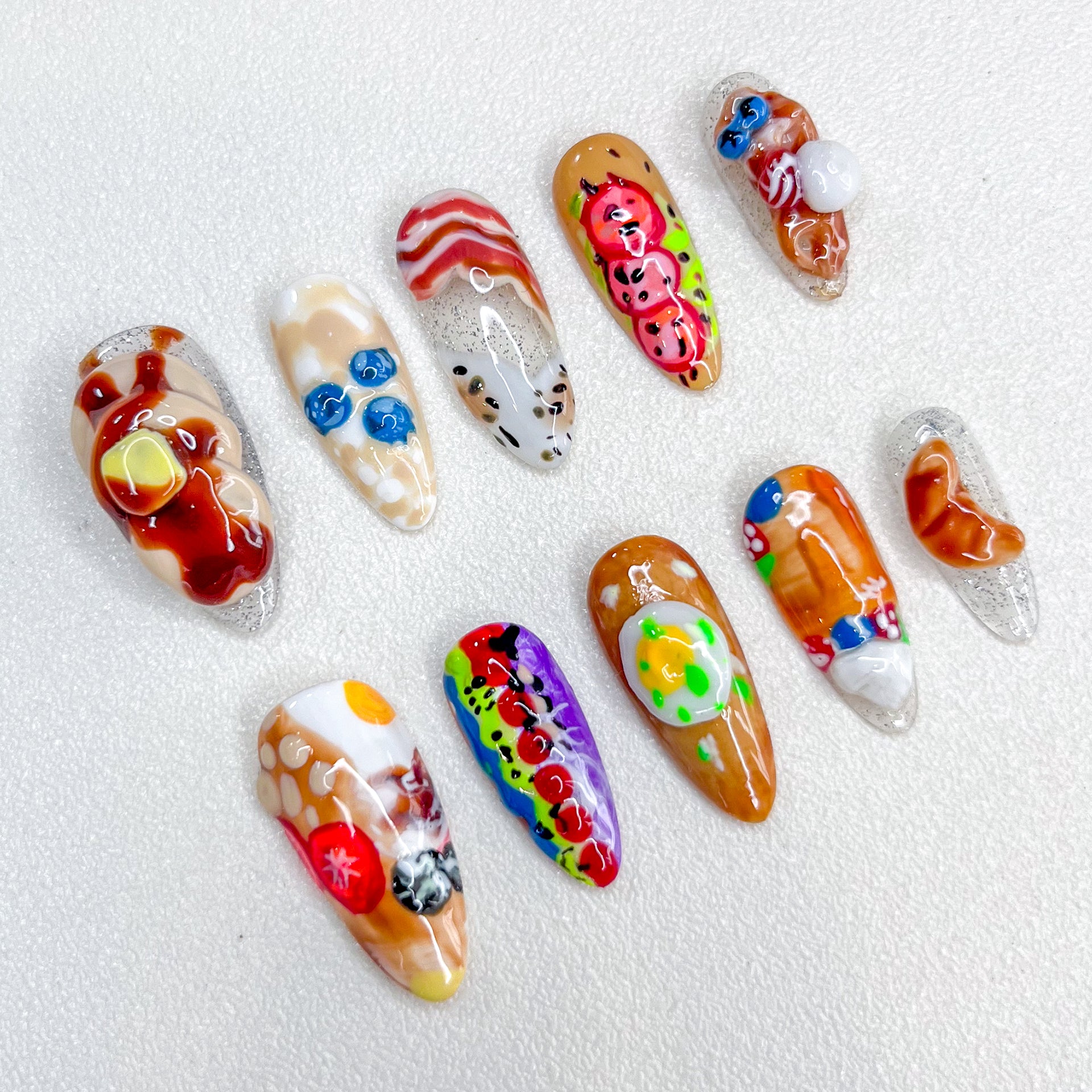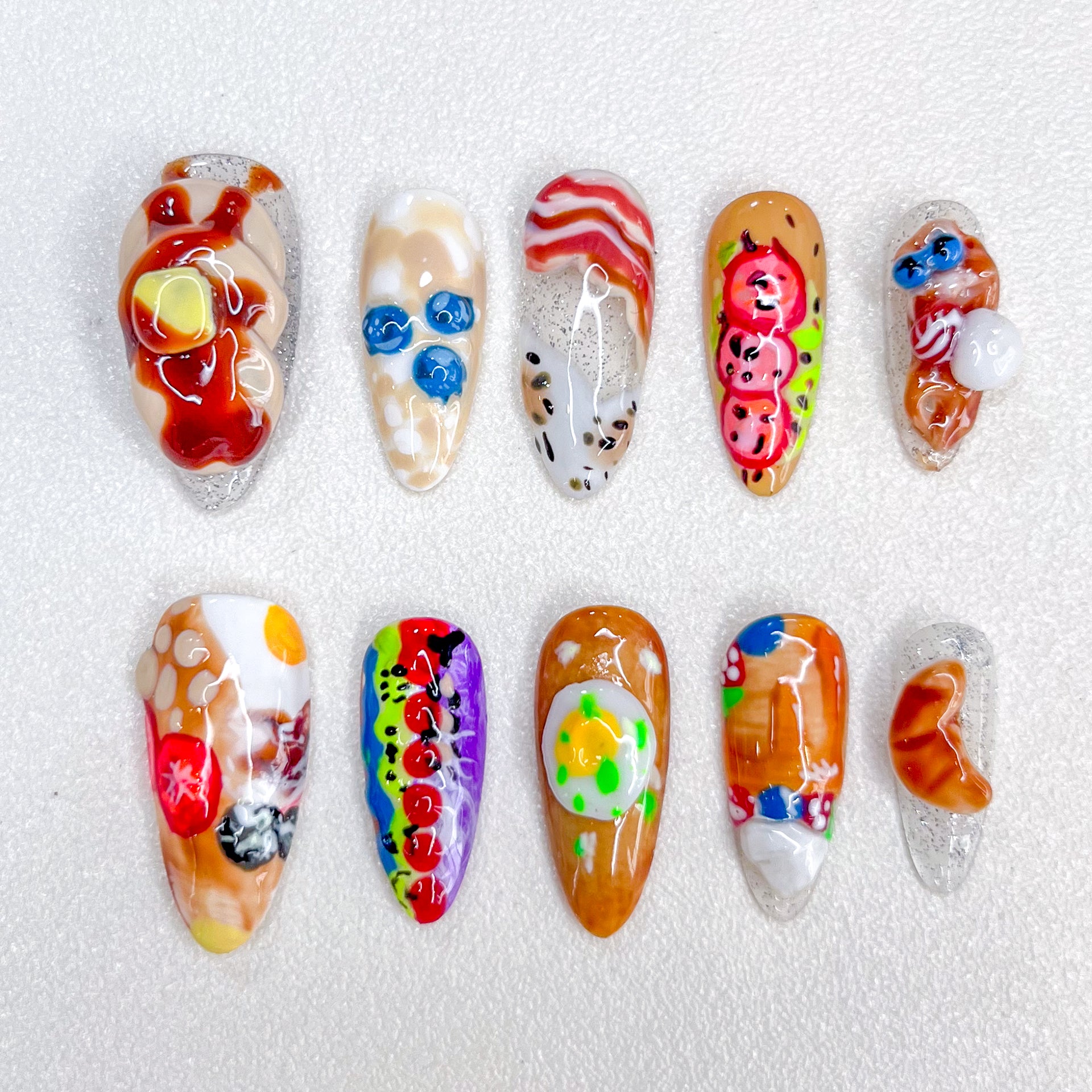 Design Concept: "Energetic Breakfast" captures the vibrant spirit of a perfect morning meal. Featuring designs inspired by flaky croissants, sunny-side-up eggs, and a splash of colorful jam, each nail brings the freshness and energy of a bright, cheerful day. This playful yet sophisticated set is perfect for those who want to start their day with style and positivity!