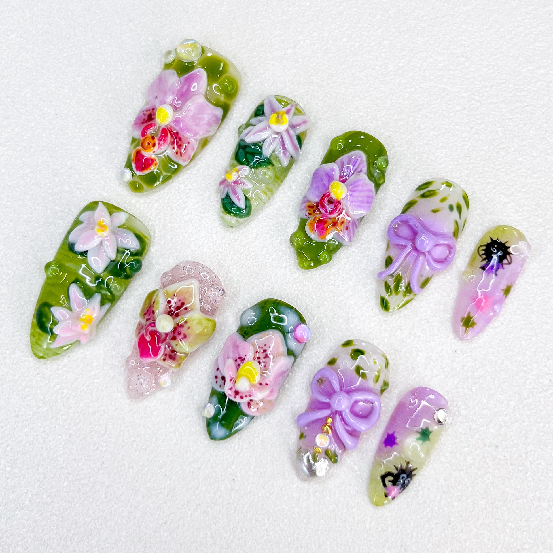 Design Concept: Embrace the lush beauty of a garden where vibrant purples and greens blend with blossoming flowers and grasses. Let your nails reflect the enchanting allure of nature's most vibrant sanctuary.