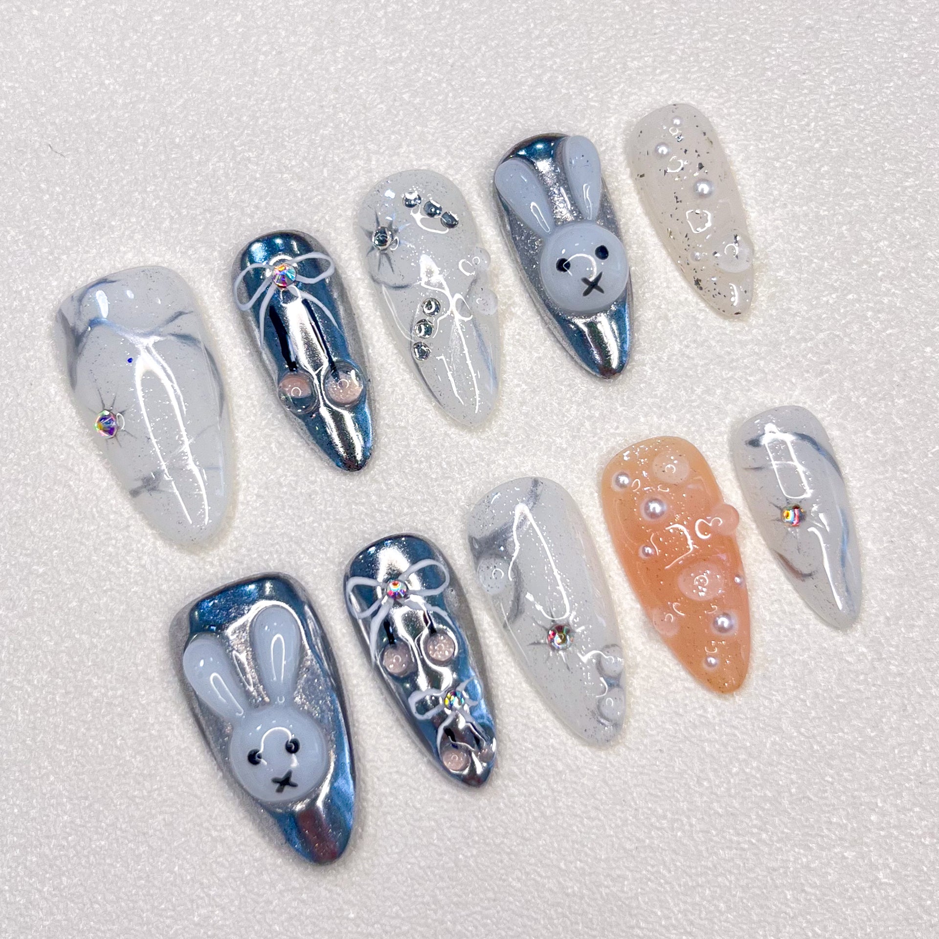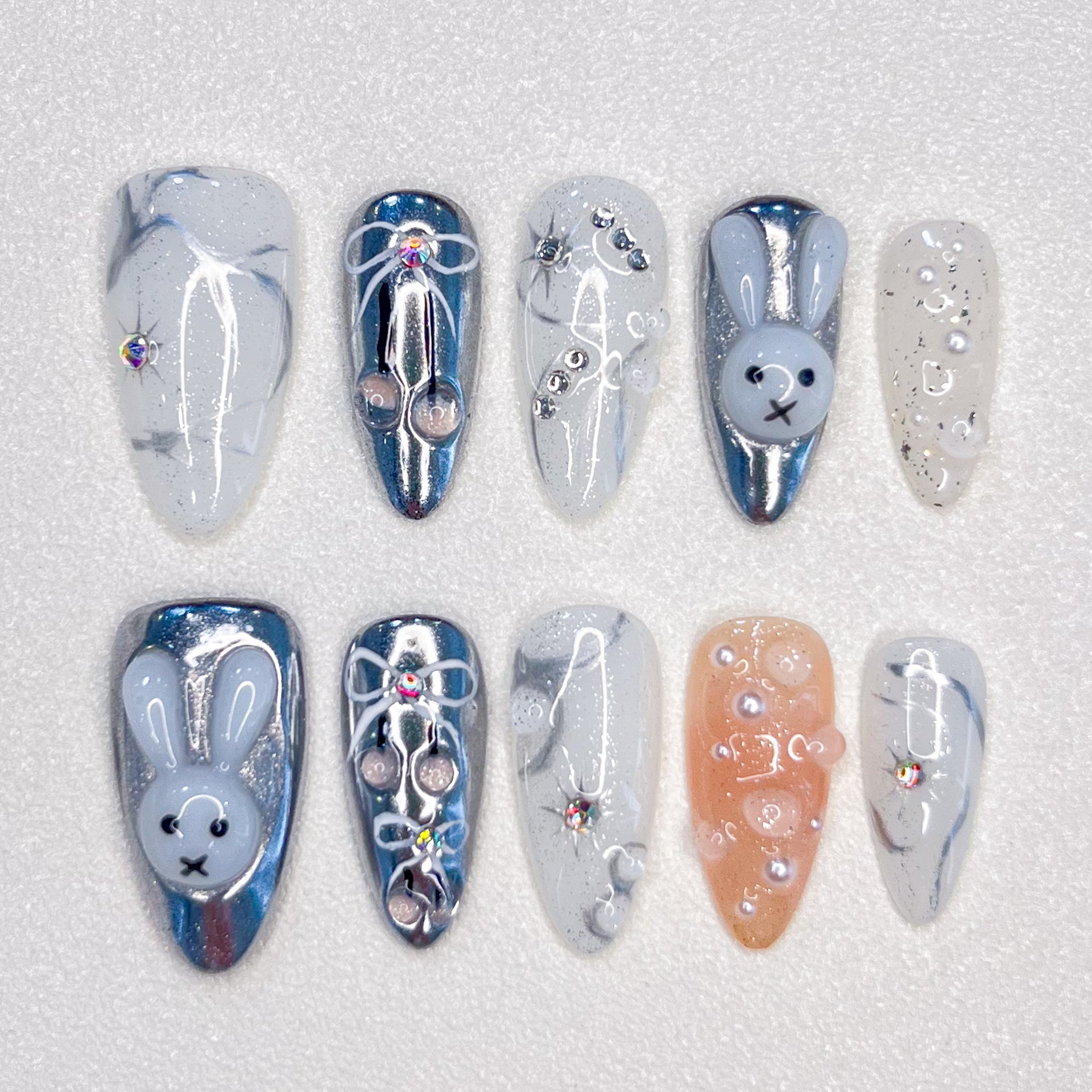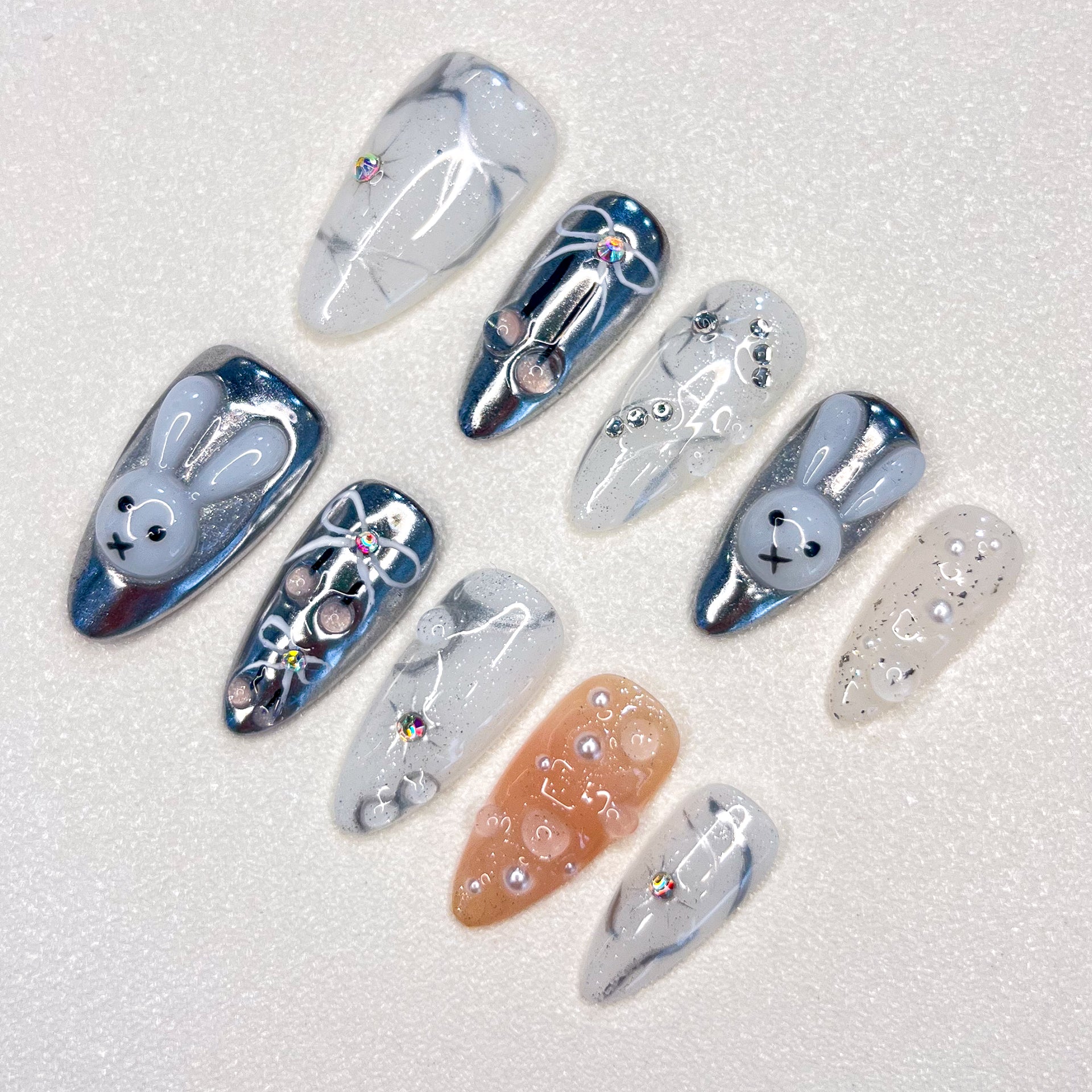 Design Concept: Embrace the cool elegance of frosted blue and gray, with a hint of whimsical charm from our bunny motif. Perfect for adding a touch of enchantment to your style.