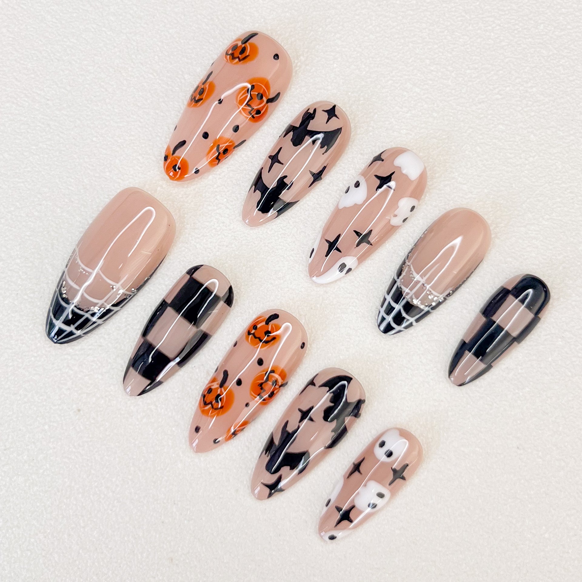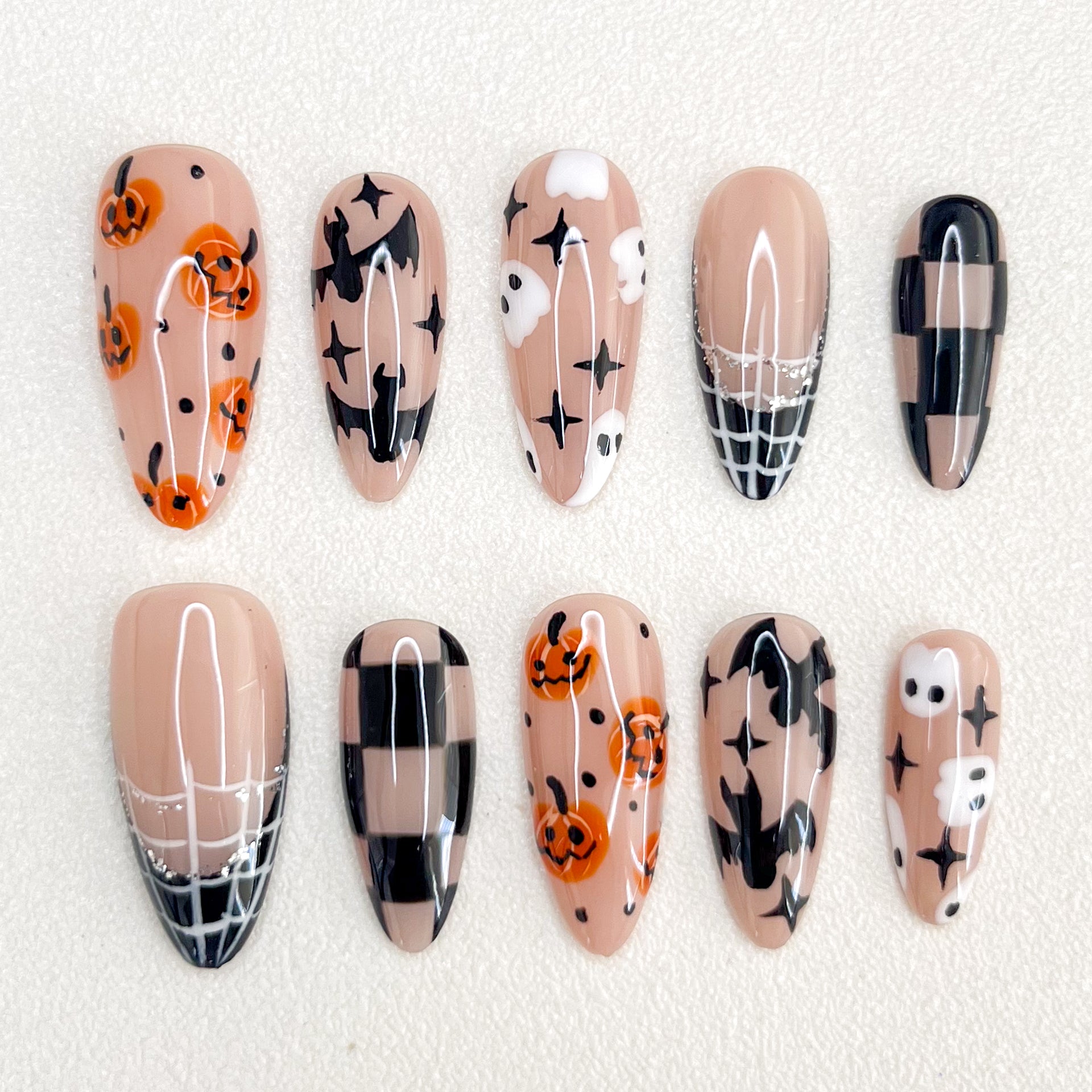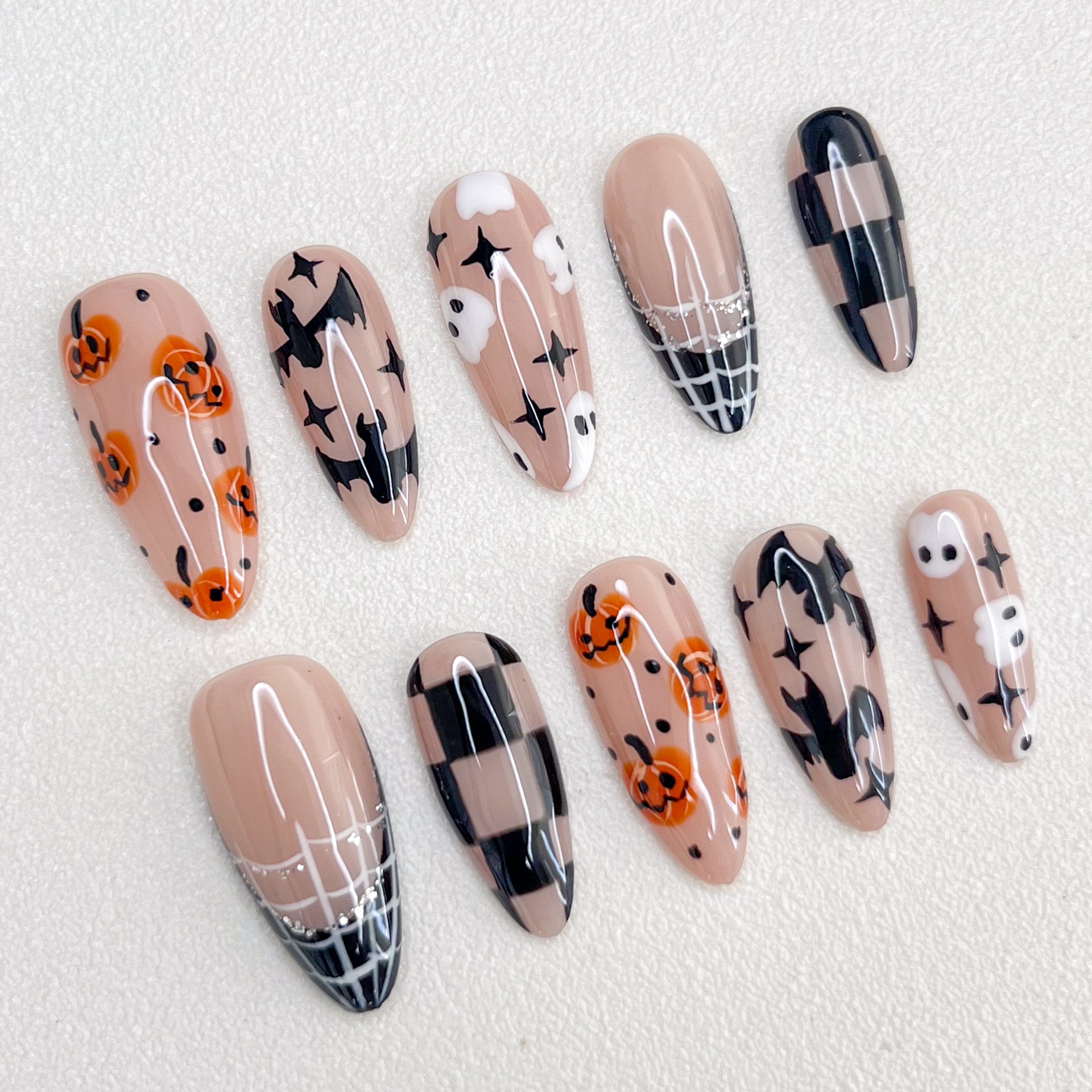 Design Concept: Embrace the magic of Halloween with "Halloween Nightfall." This enchanting design features spooky pumpkins, playful ghosts, and mystical bats, capturing the essence of a night full of eerie delights. Perfect for adding a touch of Halloween spirit to any look!