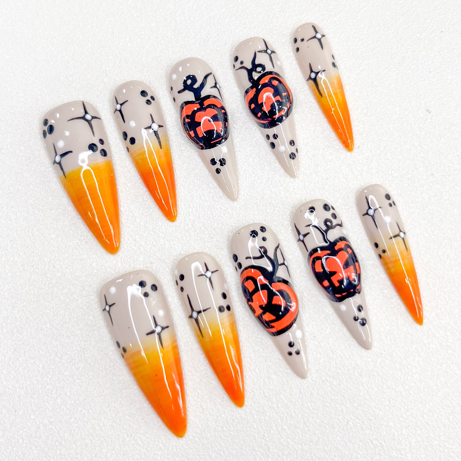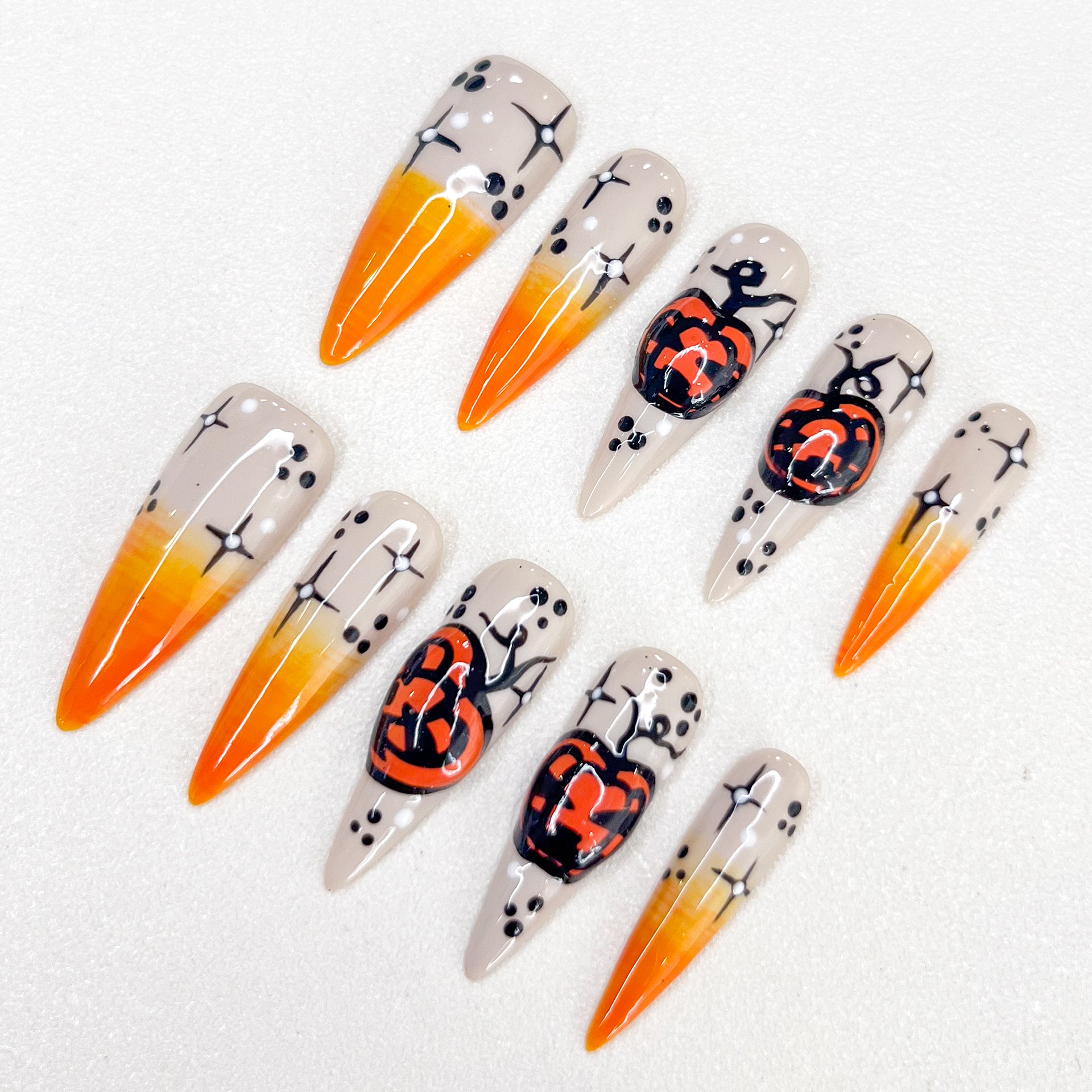 Design Concept: Illuminate your Halloween with nails that channel the mischievous charm of Jack-o'-lanterns. Each detail captures the festive glow and spooky spirit, turning your fingertips into a celebration of the season.