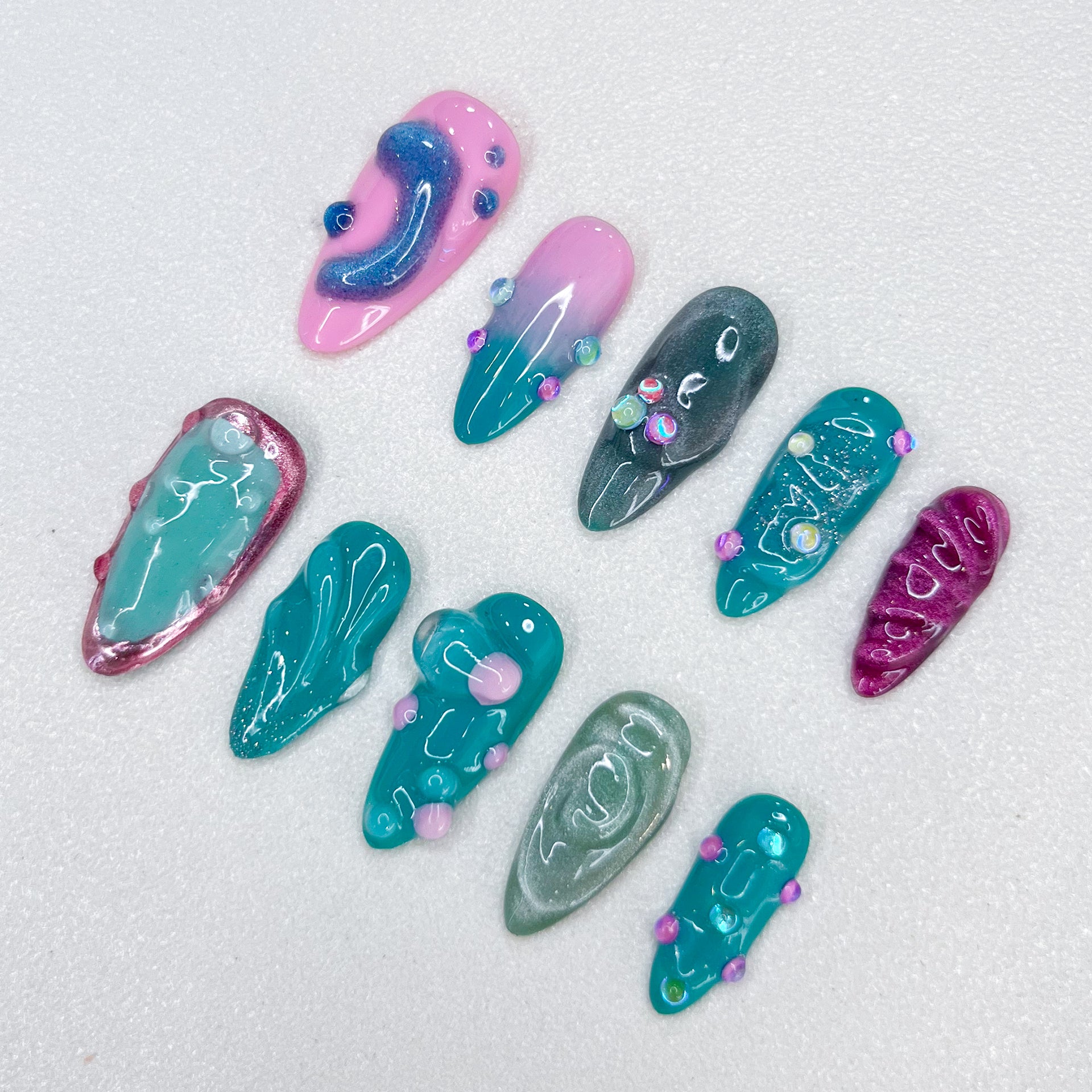 Design Concept: Dive into the serene beauty of "Jade Lake," where soft pinks meet vibrant jade green, mimicking the tranquil waters of a hidden lake. The swirling hues bring a sense of calm, while the delicate balance of colors evokes the elegance of nature's most peaceful moments. Perfect for adding a touch of refined beauty to your look.