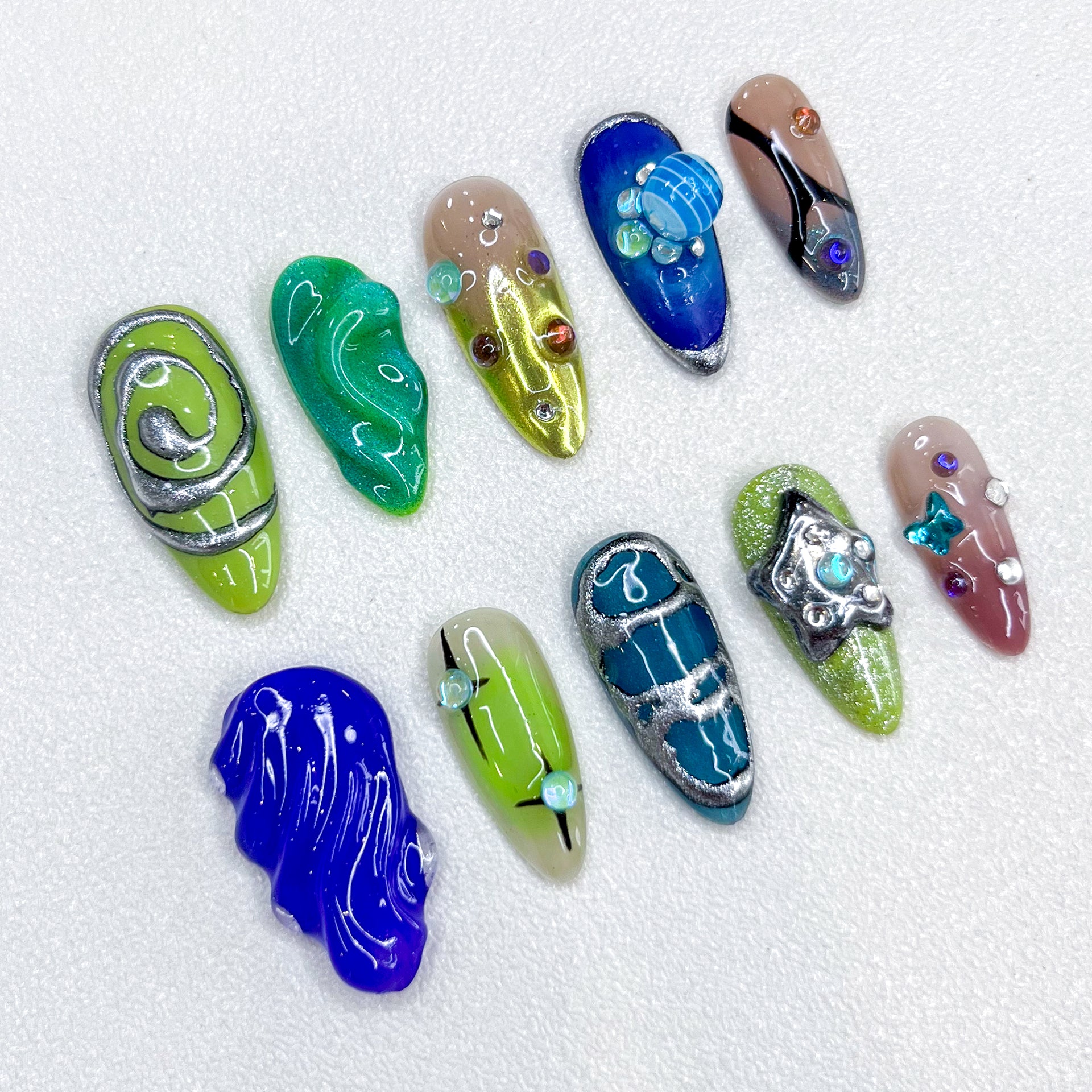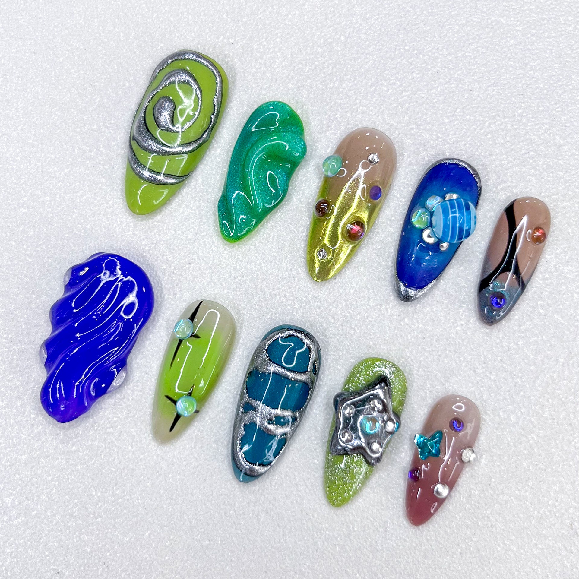 Design Concept: Inspired by the serene beauty of lakes and oceans, "Lakeside Starlight" features a harmonious blend of deep greens and blues, resembling lush seaweed and calm waters. Silver accents and starry elements add a touch of ethereal magic, evoking the peaceful charm of a night by the water.