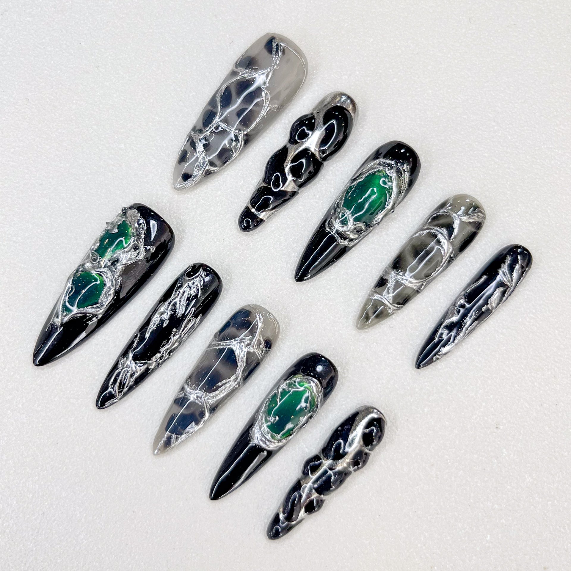 Design Concept: Immerse yourself in the allure of the night with this design, where deep black and shimmering silver combine with the mesmerizing sparkle of emerald. Perfect for adding a touch of mystery and elegance to any look.