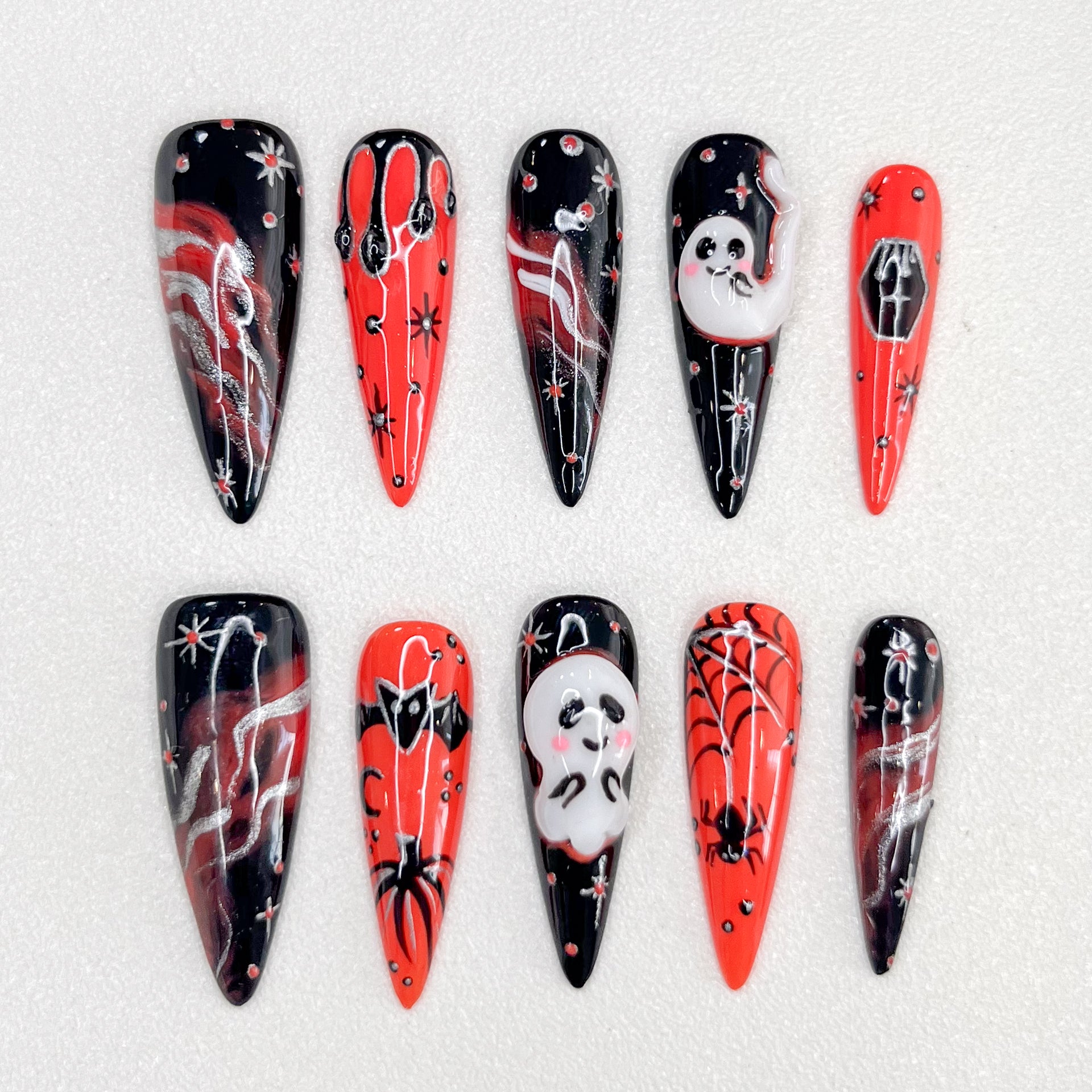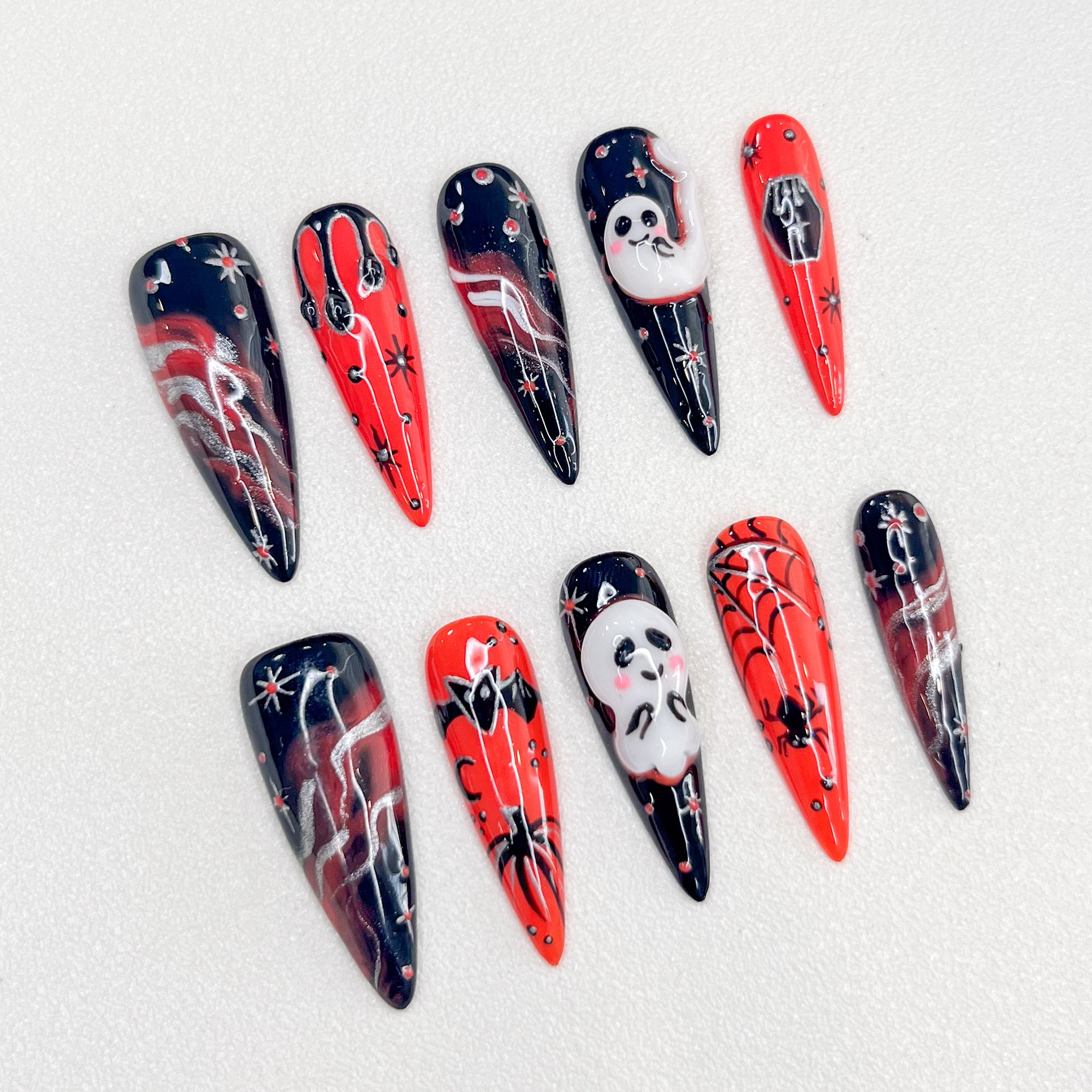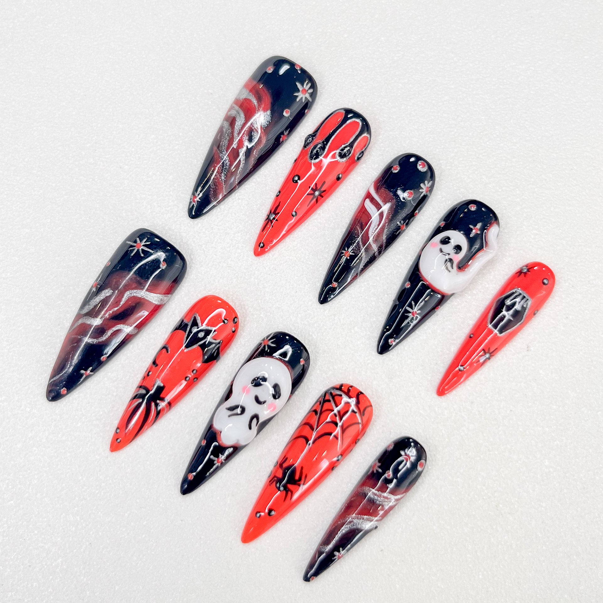 Design Concept: Embrace the spooky allure of Halloween with nails that capture the essence of a dark, haunted night. Red and black intertwine with ghostly apparitions, spider webs, and bats, creating a look that’s both eerie and electrifying.