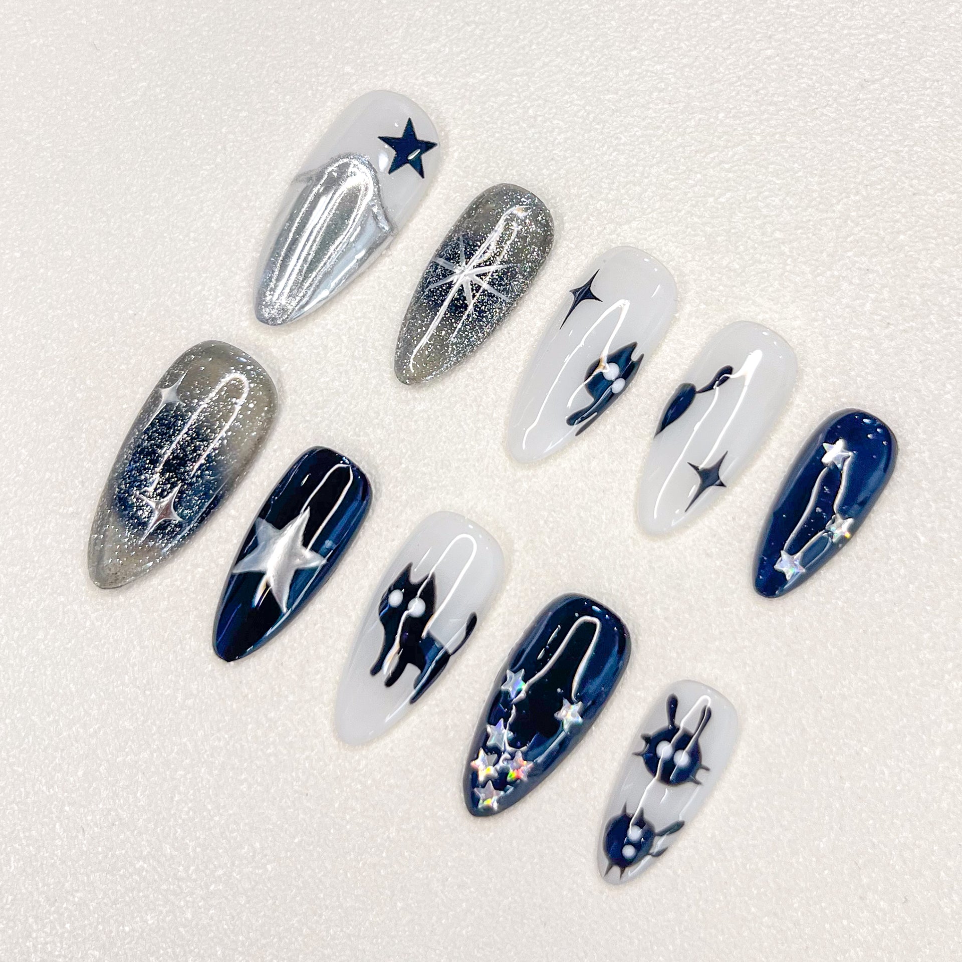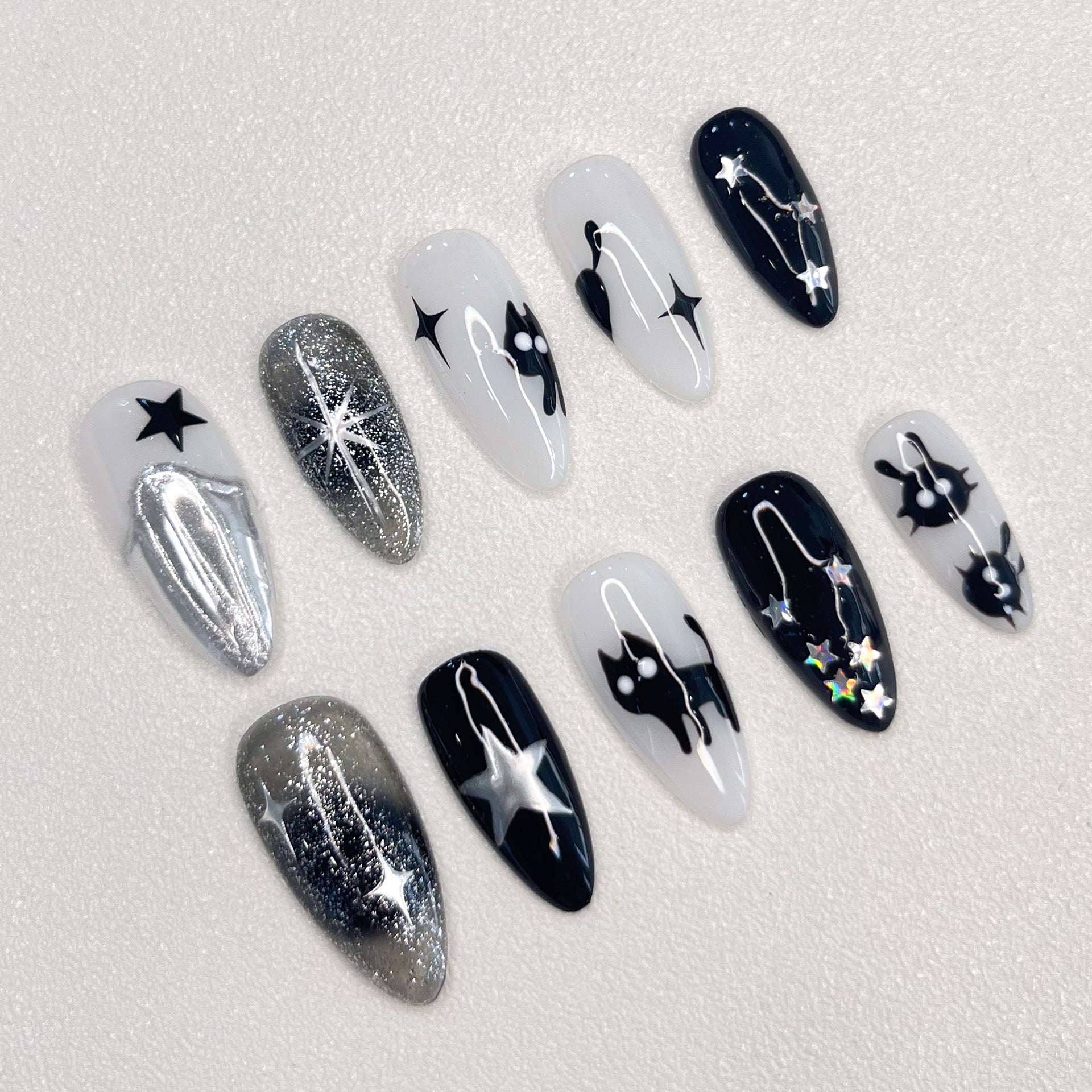 Design Concept: Under the veil of night, stars twinkle and the mystery of the black cat unfolds. Let your nails shimmer with the allure of the dark, where magic and stardust collide.