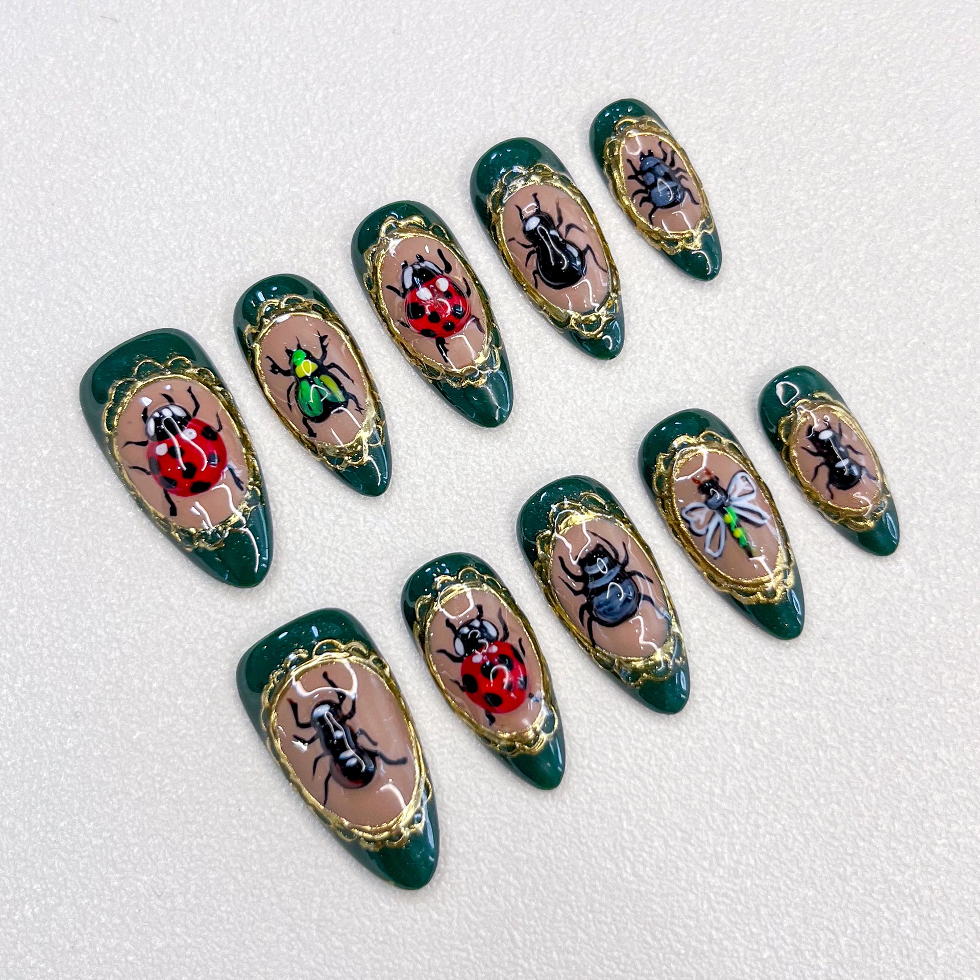 Design Concept: Dive into the enigmatic world with "Mystic Beetle." This design encapsulates the allure and intrigue of the insect realm, featuring intricate patterns and deep, mysterious hues. Embrace a touch of the unknown with every glance at your uniquely captivating nails.