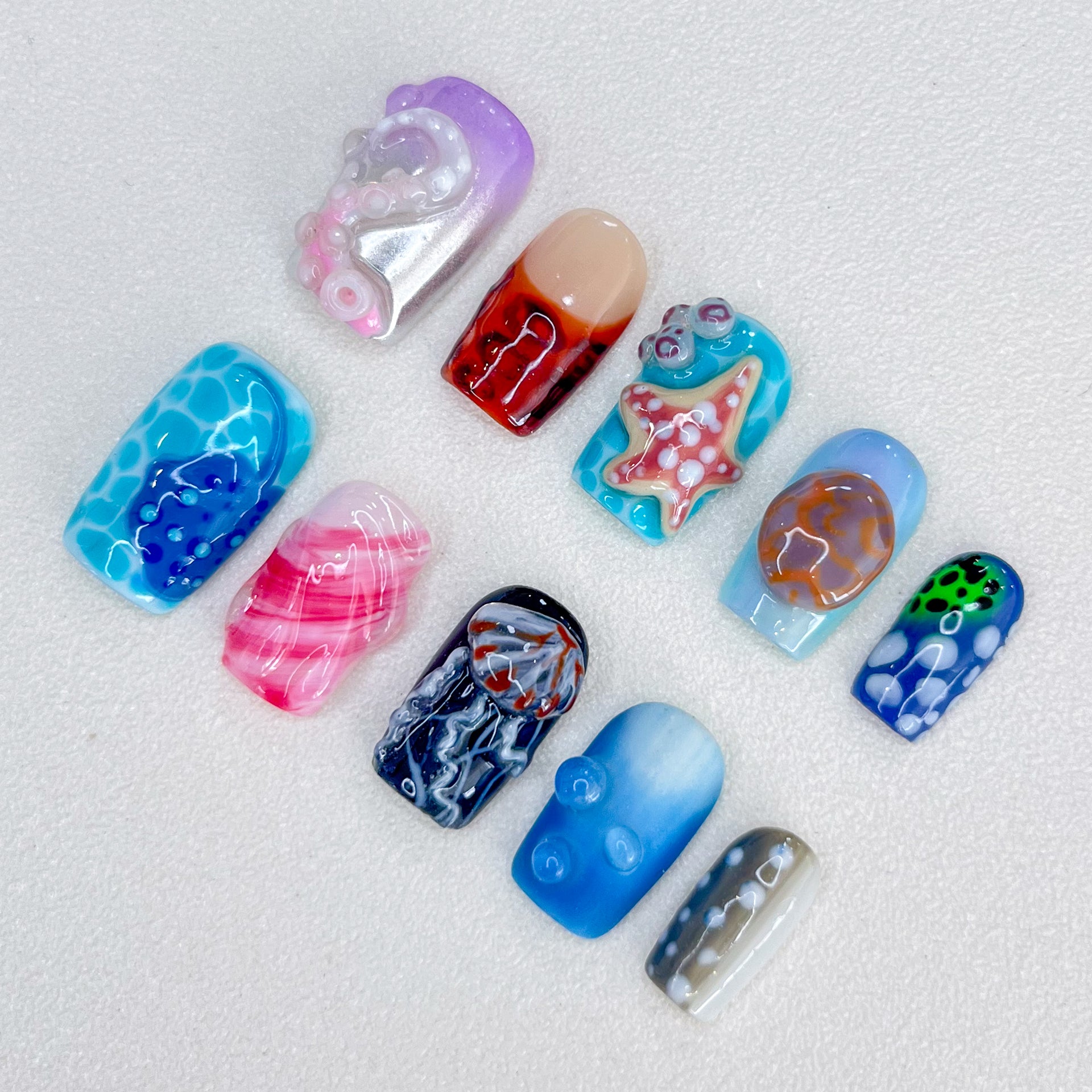 Design Concept: Dive into a world of oceanic wonders, where delicate seashells and playful starfish dance beneath the waves. Let the elegance of the deep sea adorn your fingertips, capturing the magic of the ocean.