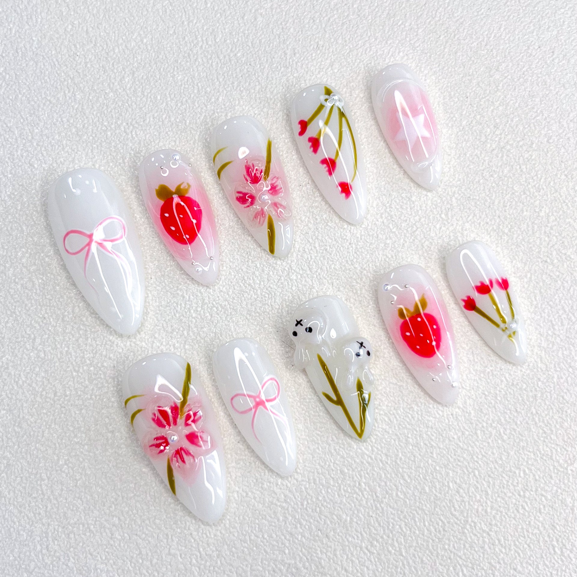 When applying, place the press-on about 2mm away from your cuticle, then press down and gently push back for a secure fit.