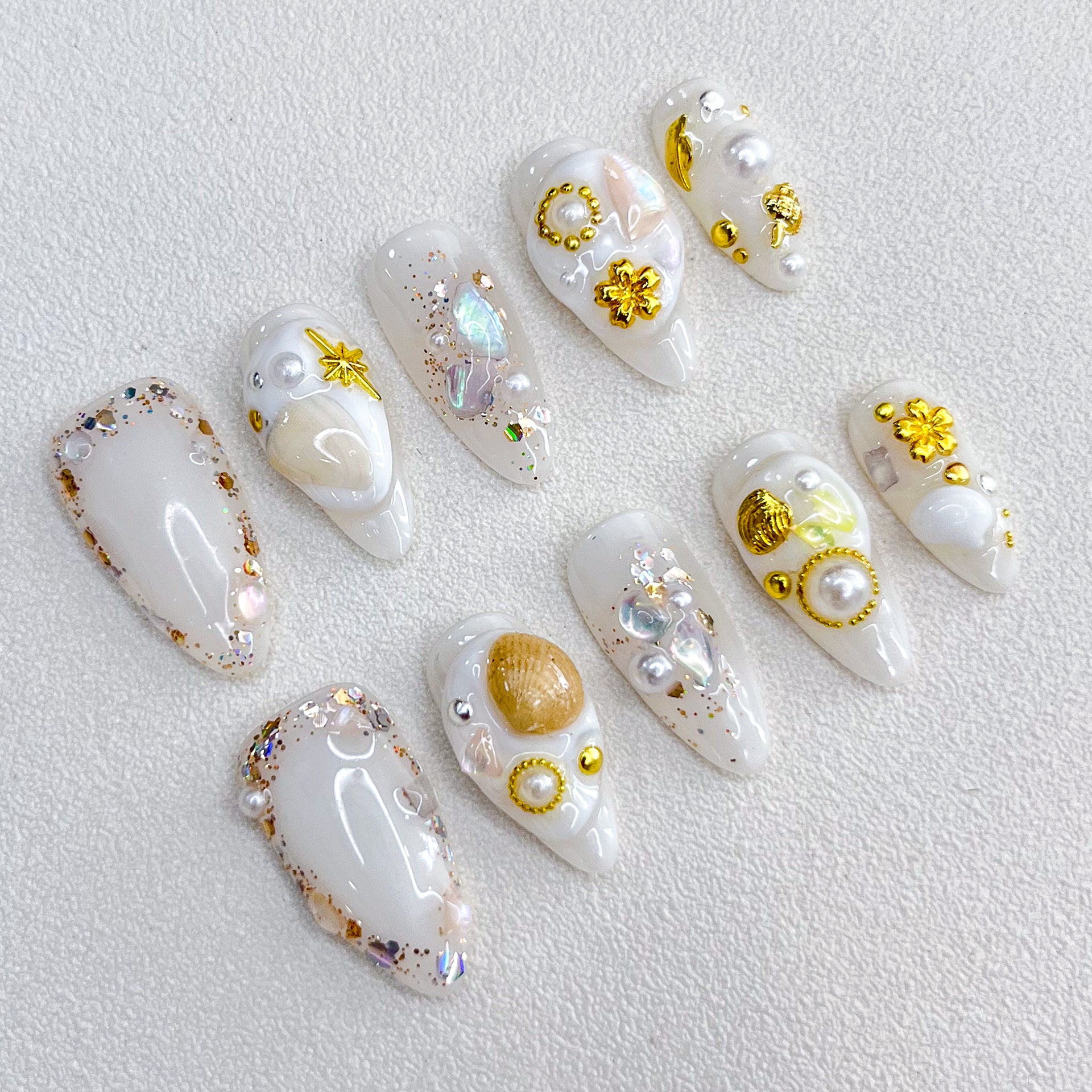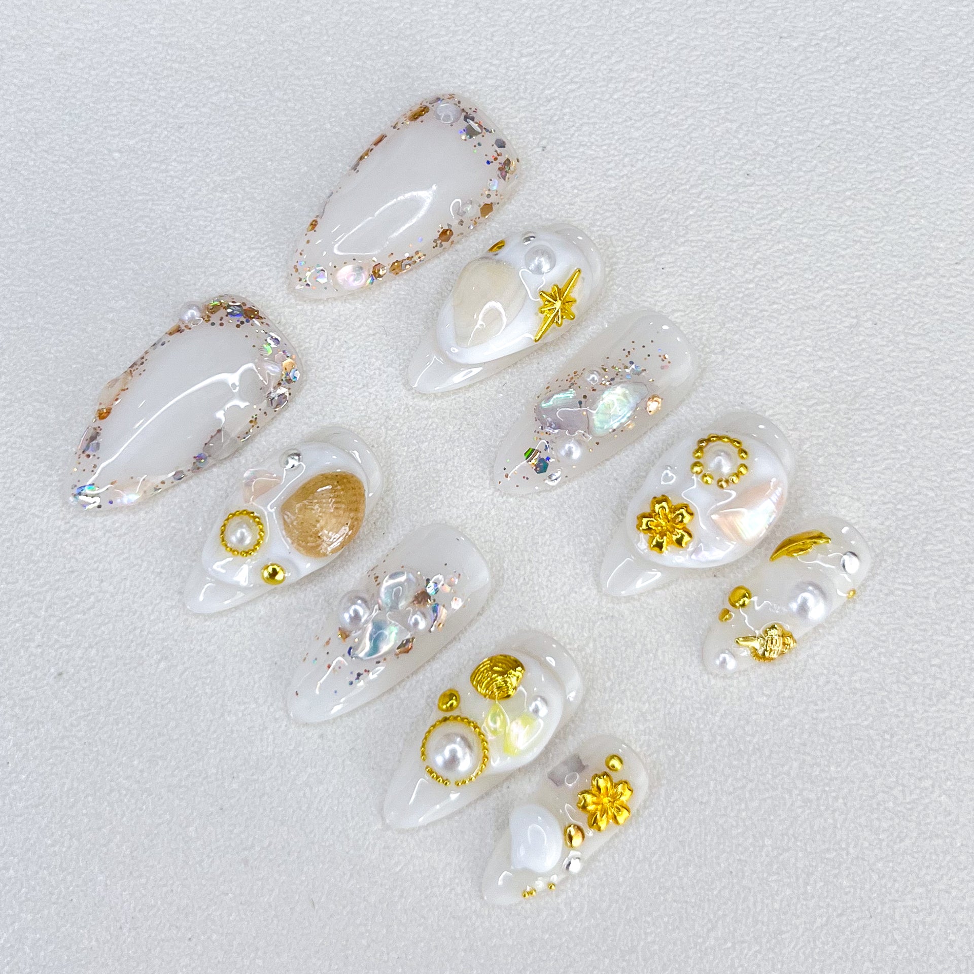 Design Concept: In the hush of a summer night, as golden seashells reflect the glimmer of distant stars, a trail of shooting stars lights up the sky, weaving dreams into reality. Your nails become a portal to this enchanting world, where every shimmer tells a tale of cosmic wonders and deep-sea mysteries.