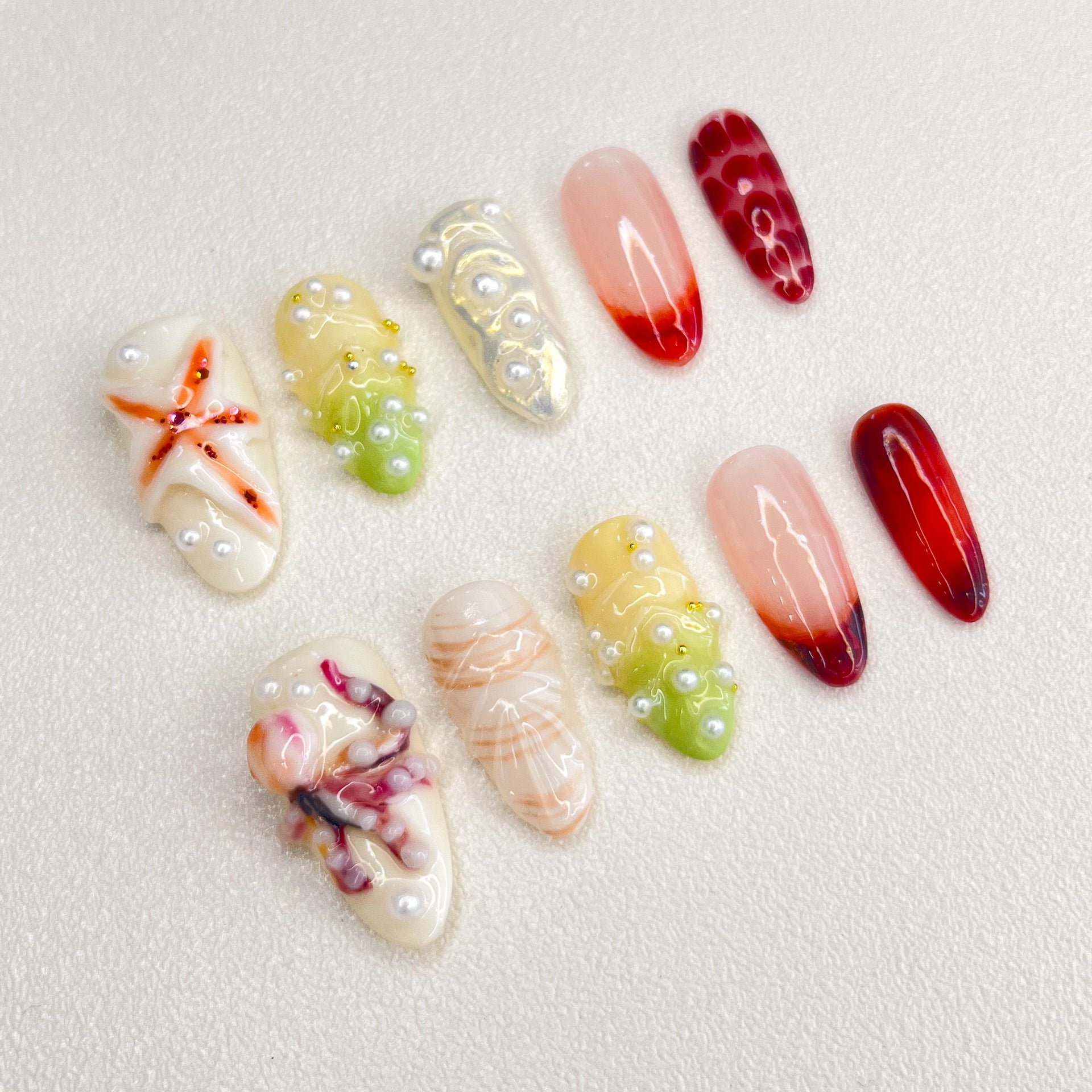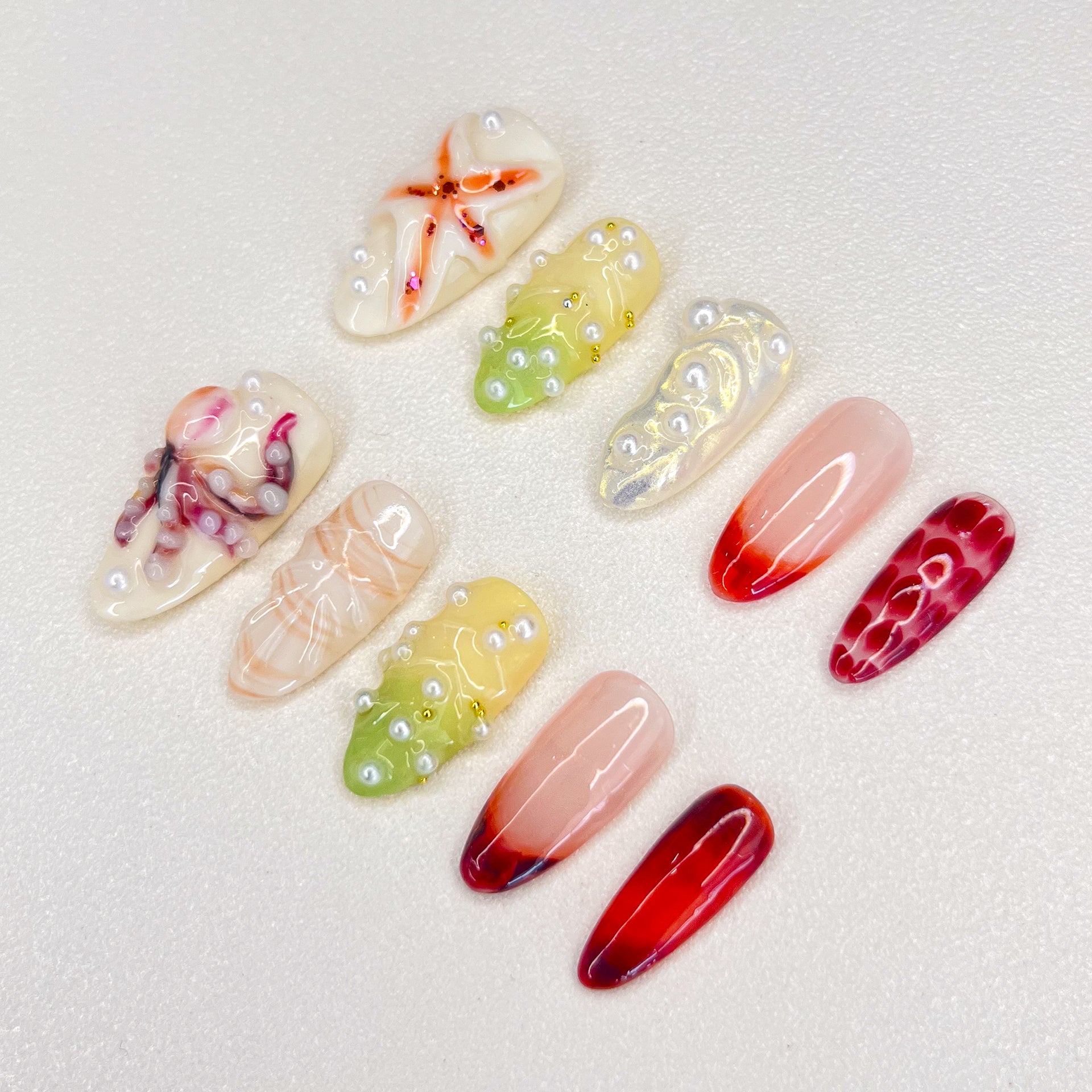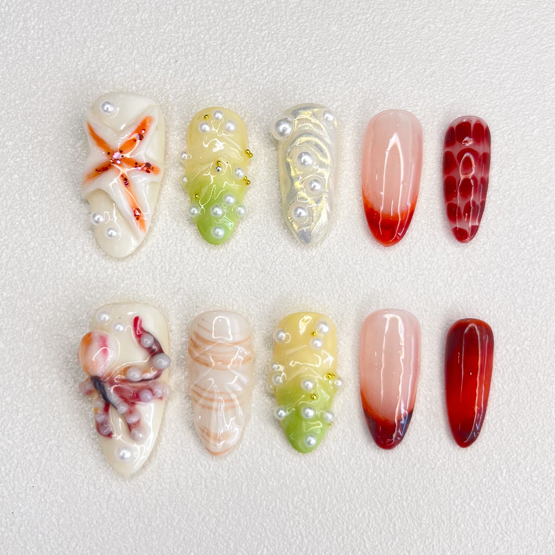 Design Concept: Embrace the celestial charm of 'Starlit Tide Symphony,' where the shimmering starlight dances over starfish and octopuses, all bathed in the golden glow of the setting sun. This design weaves together the magic of twilight with the beauty of the ocean, creating a timeless symphony of elegance and wonder.