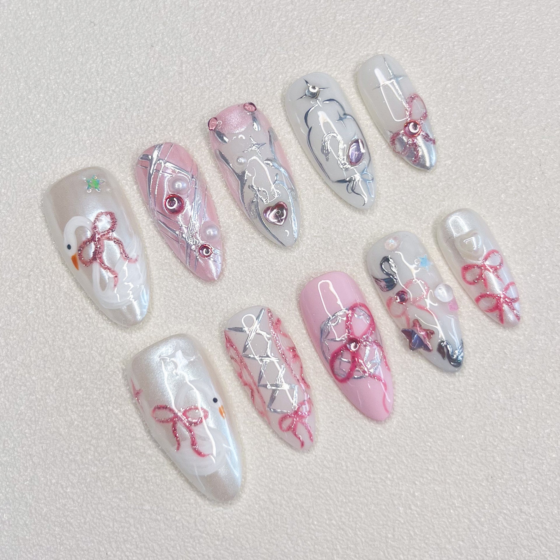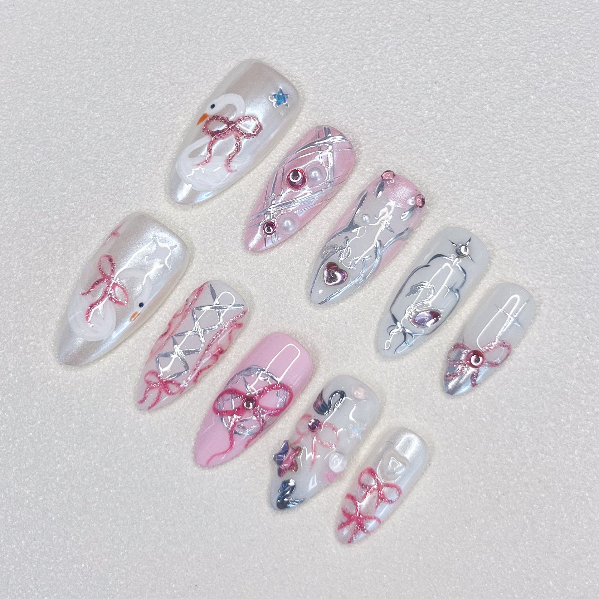 Design Concept: A delicate blend of pink hues, silver gleams, and soft bows, capturing the grace of a swan in every flutter.